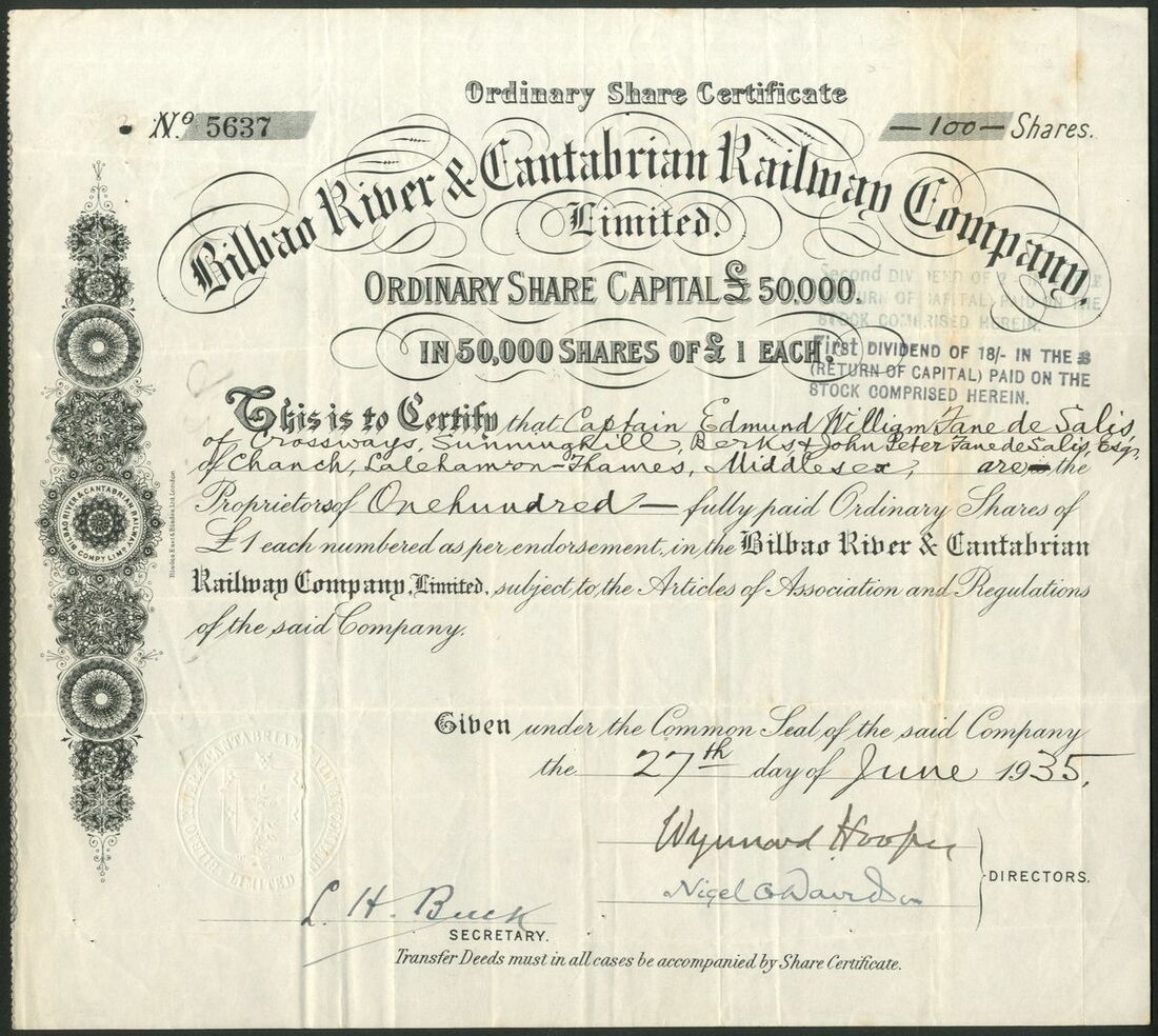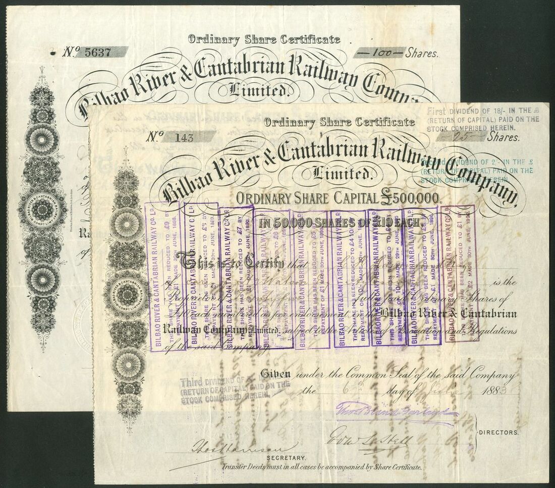 Spain: Bilbao River & Cantabrian Railway Company Limited, pair of ordinary share certificates, 188[3], #143, cap. £500,000 and 19[35], #5637, cap. now £50,000, plus a preference share, call certificate, 1883, all black. Registered in London in 1871 as Bilbao Iron Ore Co. Ltd., name changed in 1883. A narrow gauge line serving the local iron mines. In liquidation in 1937. VF (3).