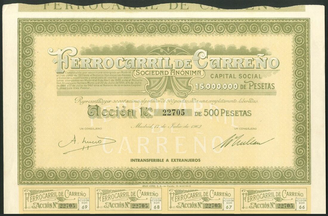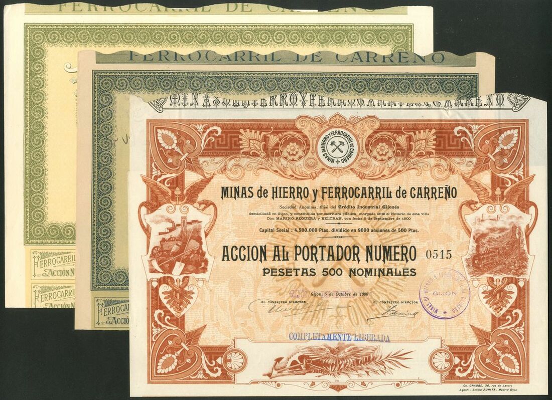 Spain: Minas de Hierro y Ferrocarril de Carreño, 500 peseta share, 1900, #0515, attractive brown printing, with coupons, together with Ferrocarril de Carreño, 500 peseta share, 1920, #6694 and 1962, #22705 (this not listed in Boone/Shakespeare), both green, with coupons. The first formed in Gijon in 1900 to build a narrow gauge steam line from Musel to Aviles serving the iron mines in the area. It was liquidated in 1917 and refomed in Madrid as the latter company. EF (3).
