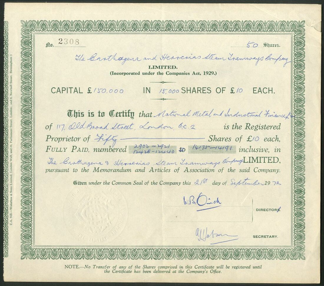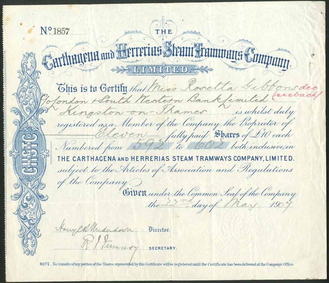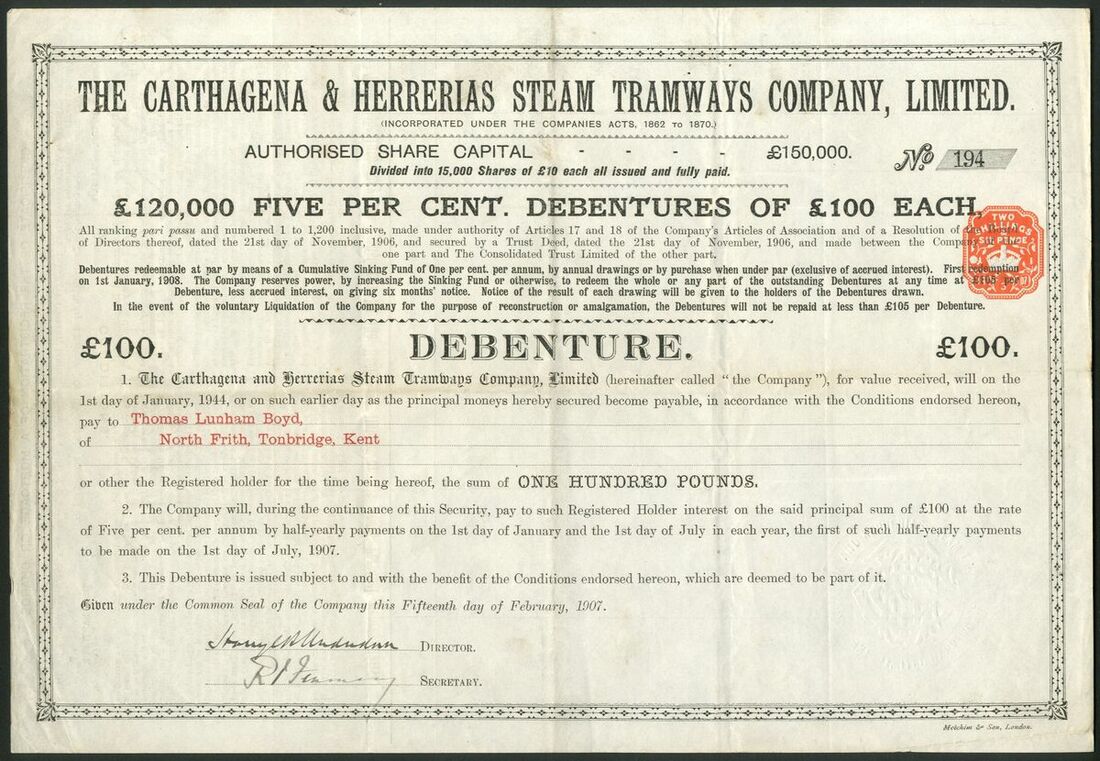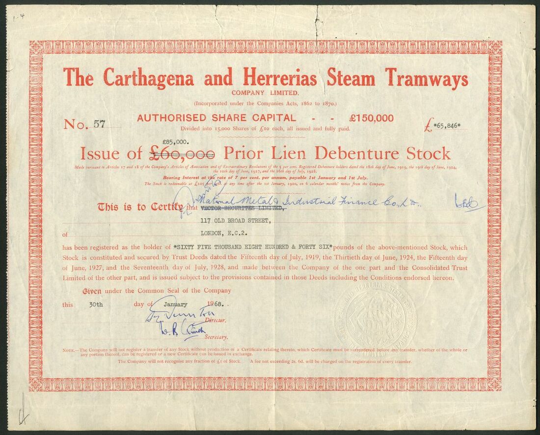 Spain: Carthagena and Herrerias Steam Tramways Co. Ltd., £10 shares, 19[07], #1857, scrollwork at left, blue. Together with a later issued dated 19[72], #2308, green; a 5% debenture for £100, 1907, #194, black, and, Prior Lien Debenture stock certificate for £[65846], 19[68], #57, red. Incorporated in London in 1872. Merged into Chemin de Fer de la Sierra de Carthagene and State owned by 1932. The company was gradually wound up over the next 40 years! VF and rare (4).