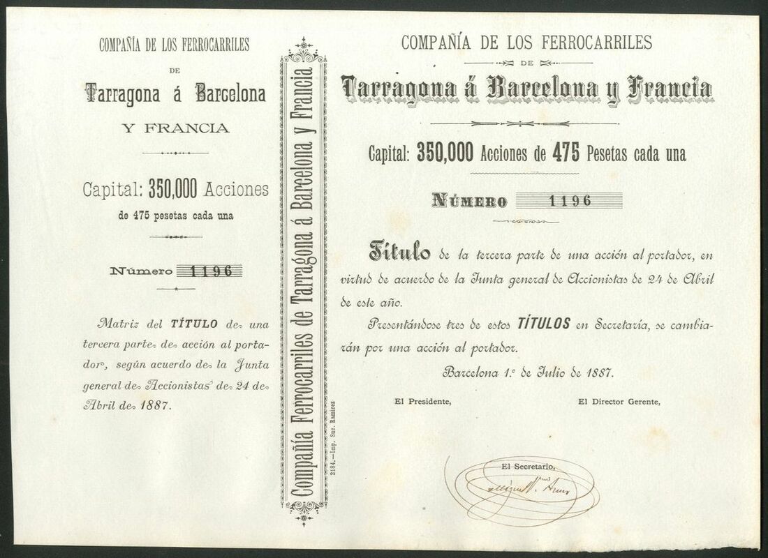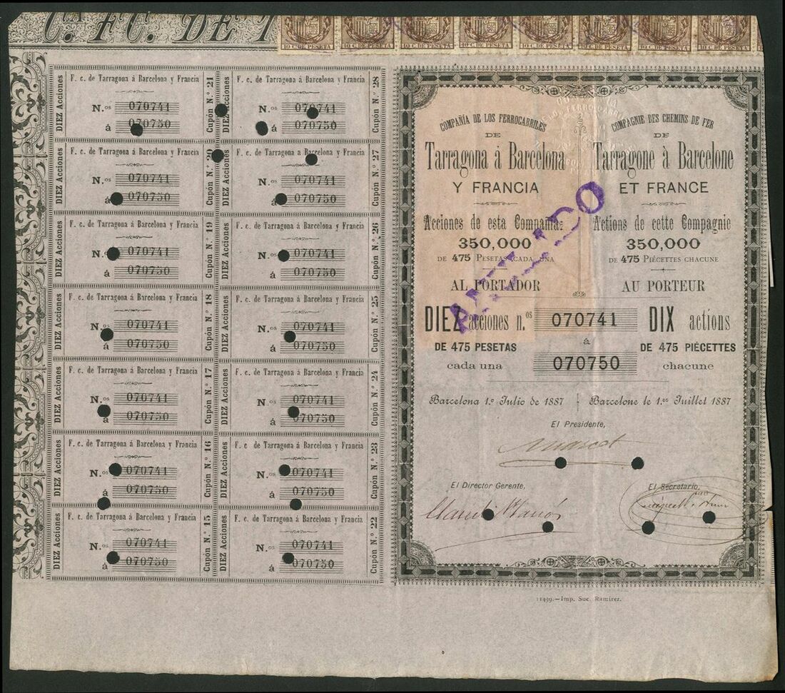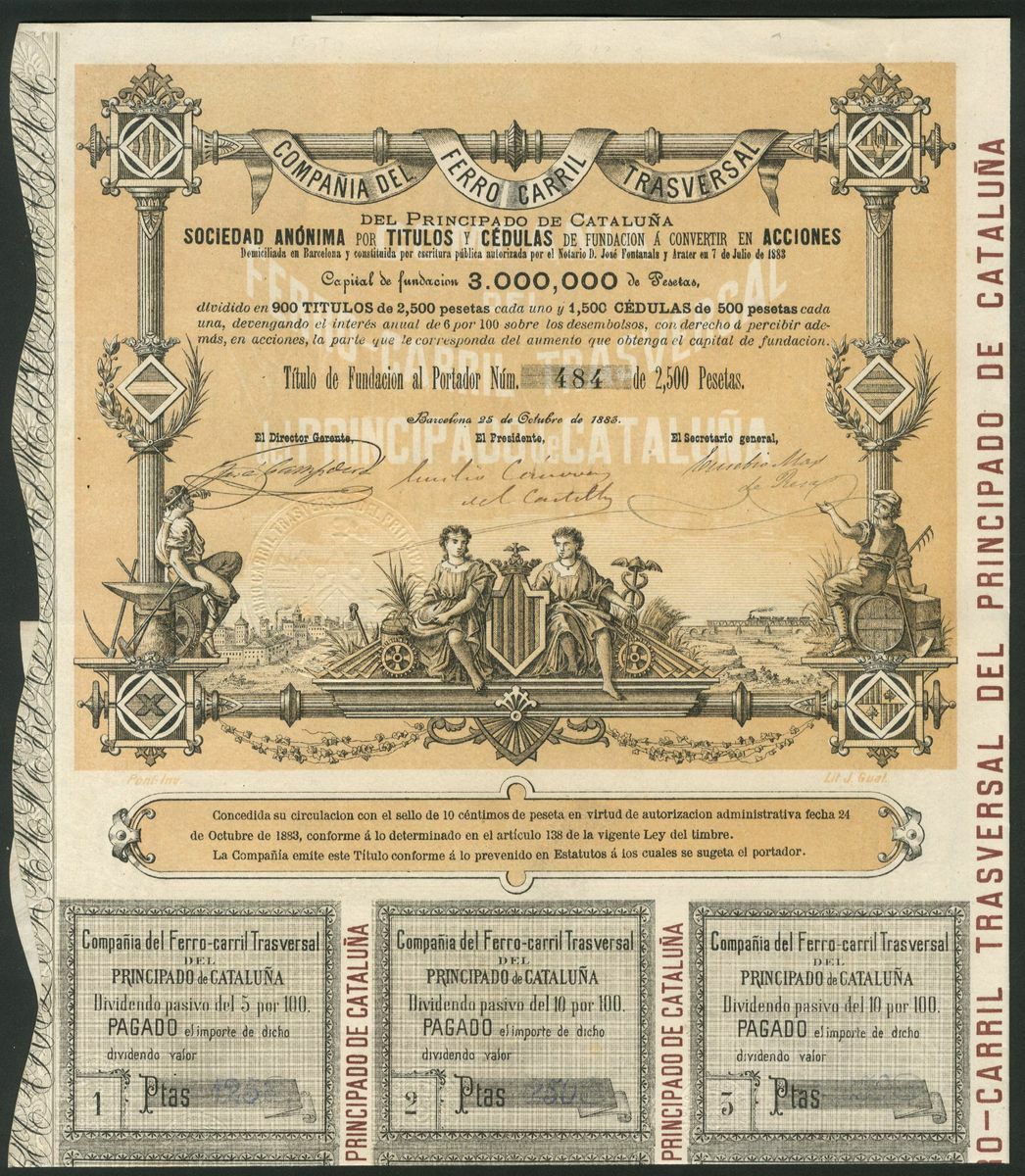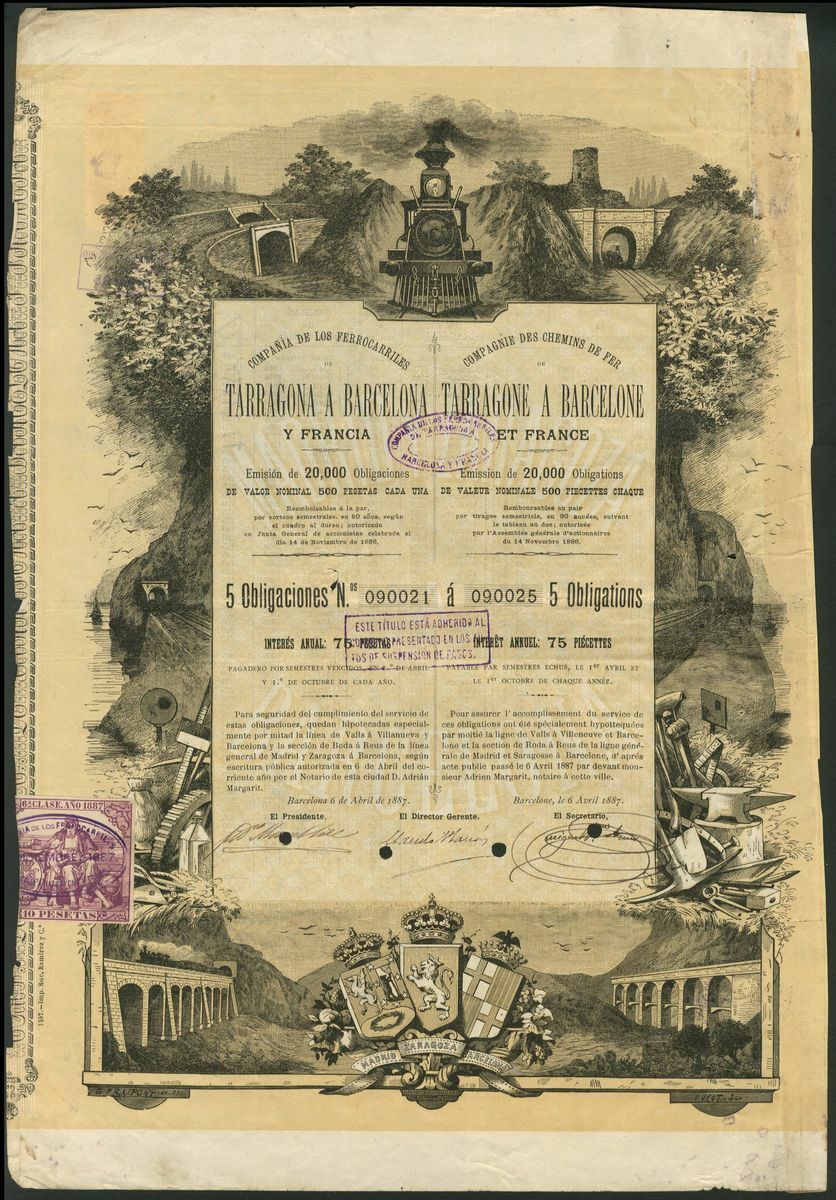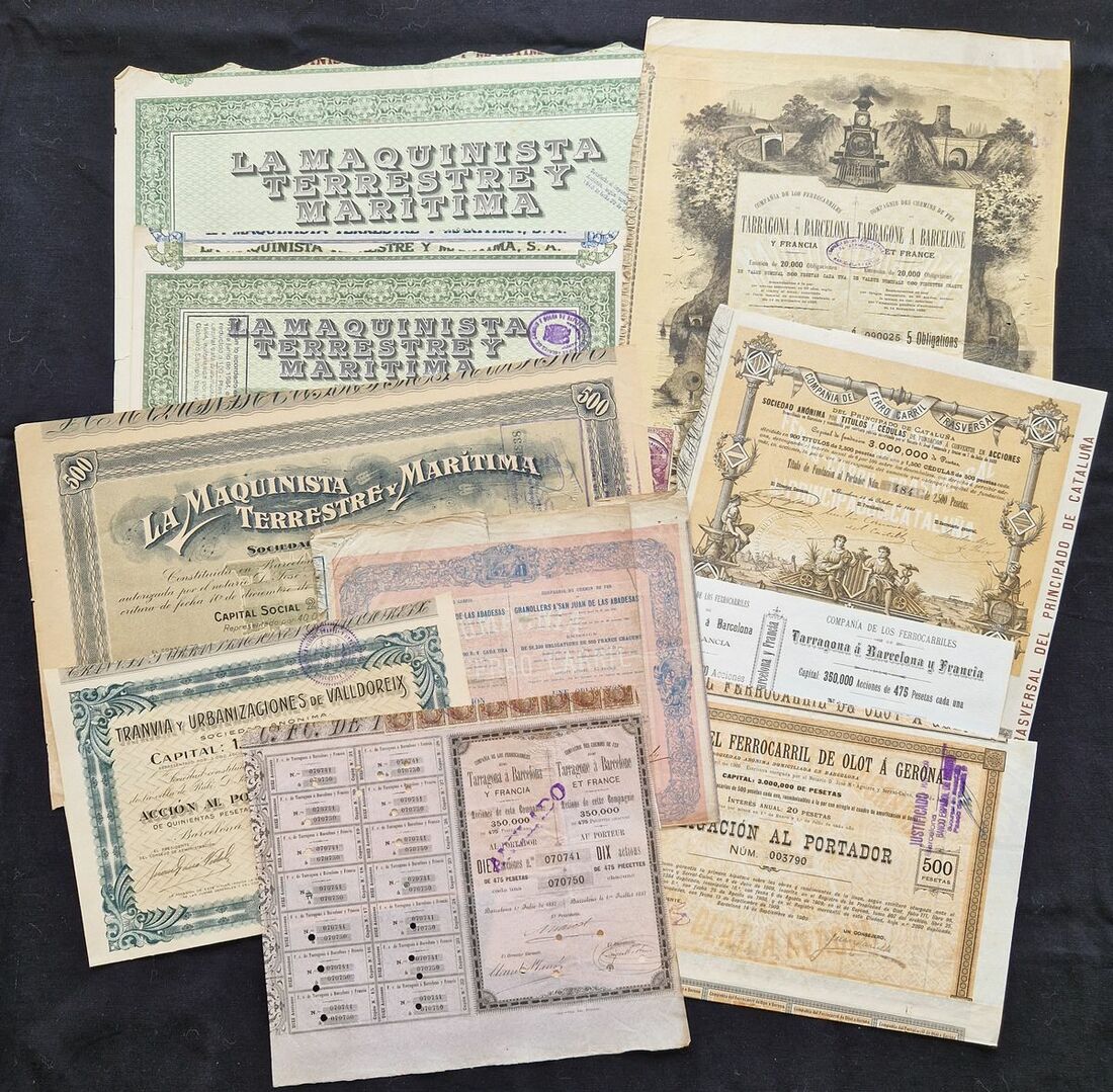 Spain: A group of Railway and Tramway certificates from Catalonia. Includes Ferrocarriles de Tarragona á Barcelona y Francia, 10 shares of 475 pesetas, 1887, 5 bonds of 500 pesetas, 1887, and, a partly issued certificate for 1/3rd share, also 1887, the first two cancelled; Ferro Carril Trasversal, founders certificate for 2500 pestas, of only 900 issued; Ferrocarril de Olot á Gerona, 500 peseta bond, 1909, and others (6). All illustrated on the website. Mostly VF and better (11).