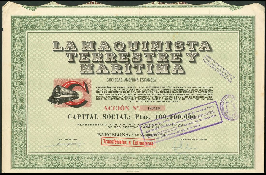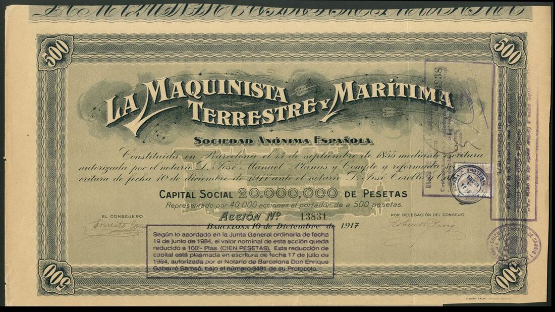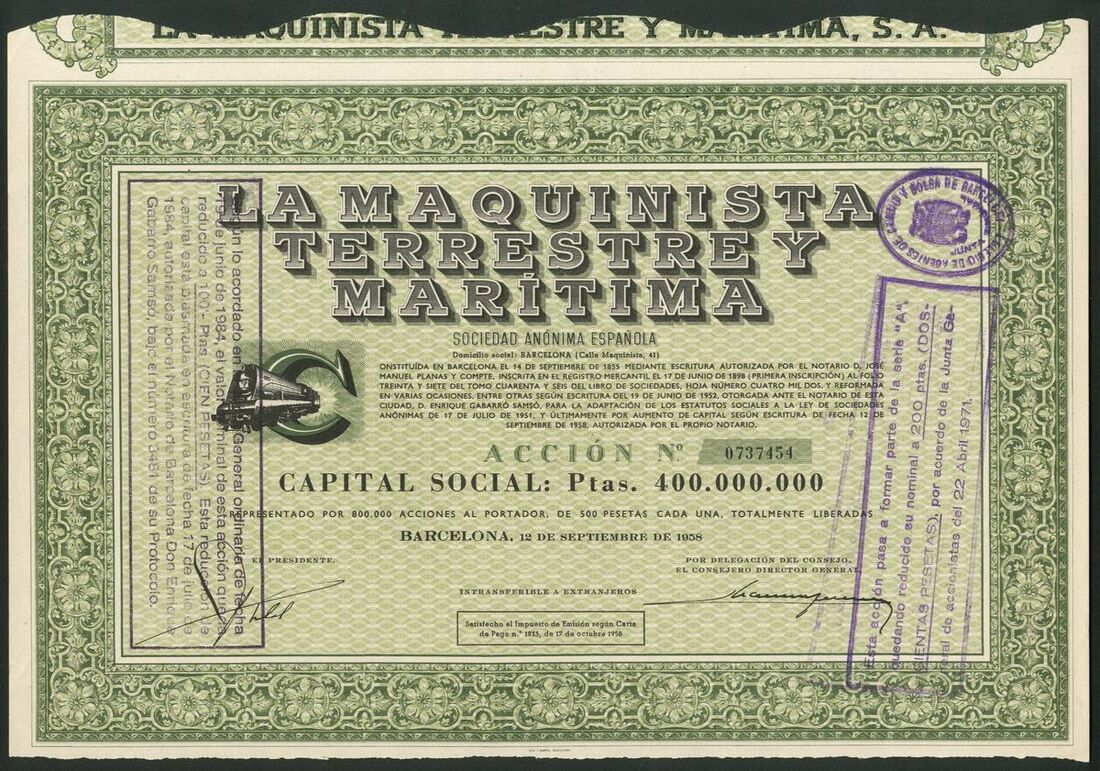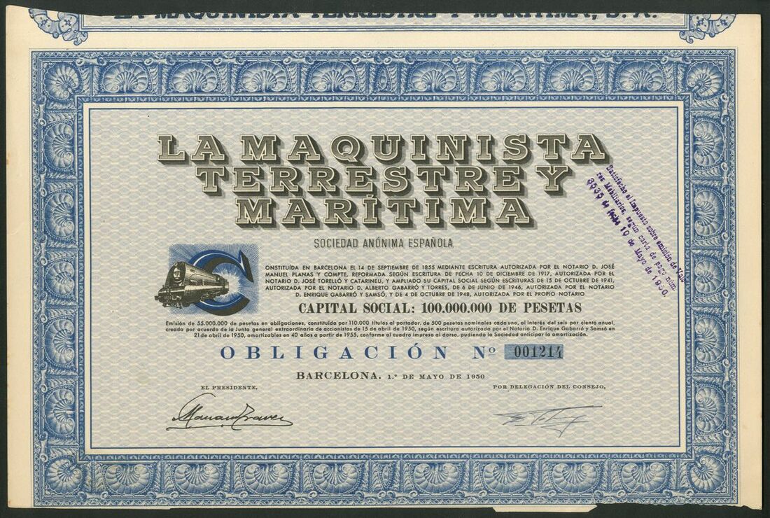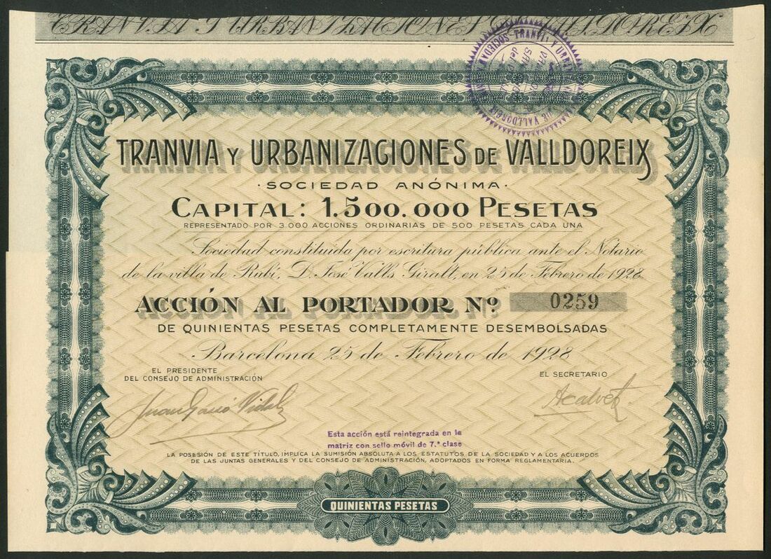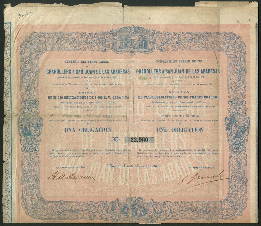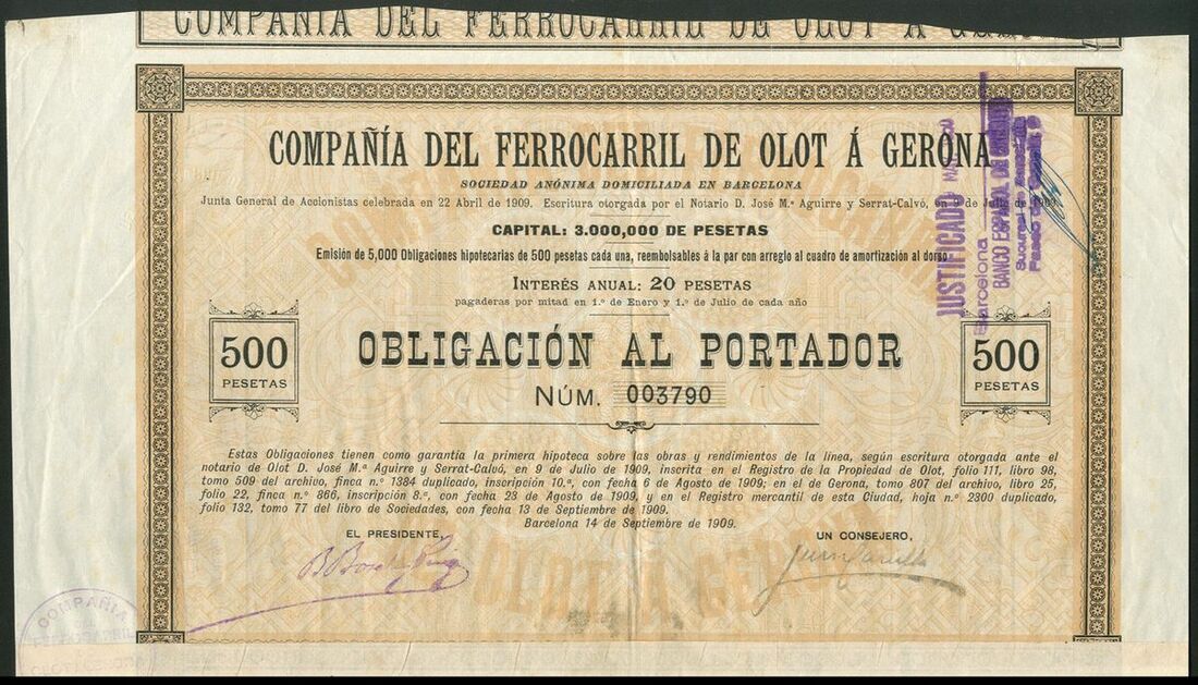 Spain: A group of Railway and Tramway certificates from Catalonia. Includes Ferrocarriles de Tarragona á Barcelona y Francia, 10 shares of 475 pesetas, 1887, 5 bonds of 500 pesetas, 1887, and, a partly issued certificate for 1/3rd share, also 1887, the first two cancelled; Ferro Carril Trasversal, founders certificate for 2500 pestas, of only 900 issued; Ferrocarril de Olot á Gerona, 500 peseta bond, 1909, and others (6). All illustrated on the website. Mostly VF and better (11).