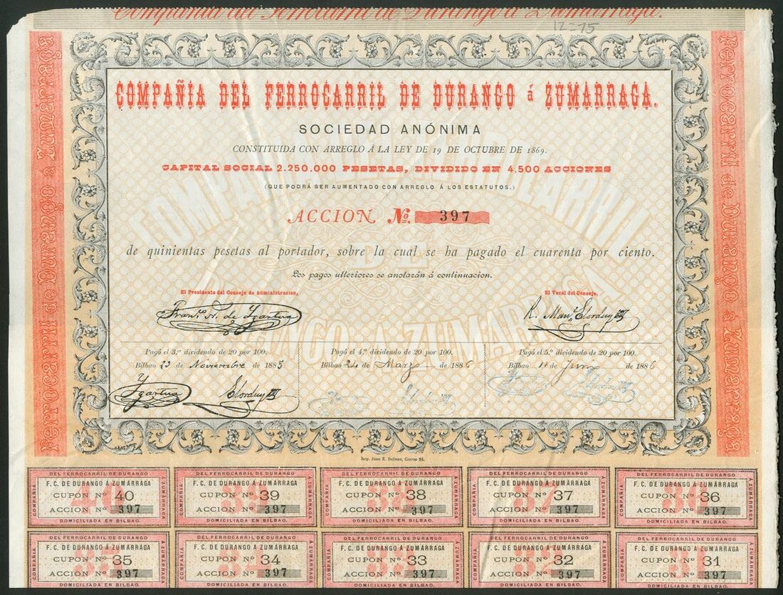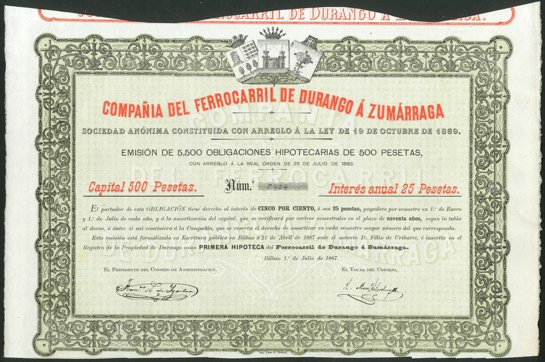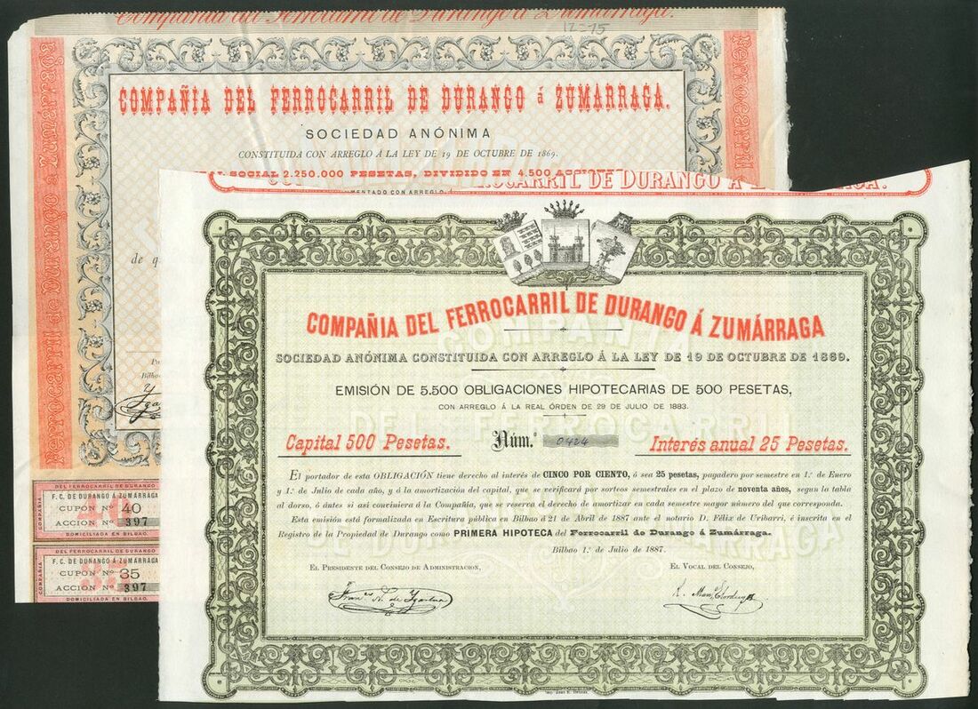 Spain: Compañia del Ferrocarril de Durango á Zumarraga, 500 peseta share, circa 1885, #397, ornate border, red and black with yellow underprint, with coupons, together with a 500 peseta mortgage bond, 1887, #0424, coats of arms at top, red and green, no coupons remain. Formed in 1869 to build a narrow gauge line. Acquired by Ferrocarriles Vascongados in 1906. The first a little creased, VF. The other EF (2).