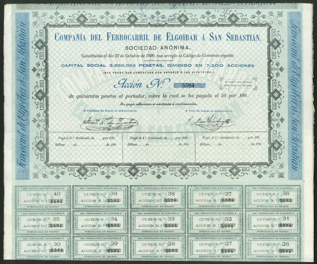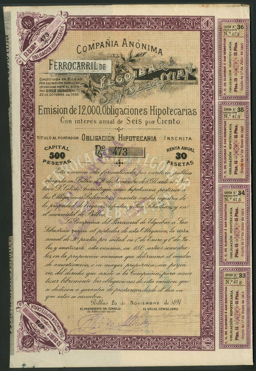 Spain: Compañia del Ferrocarril de Elgoibar á San Sebastian, 500 peseta share, 1890, #5584, blue, with coupons. Together with 500 mortgage bond, 1897, #473, mauve, yellow underprint, with coupons. Constituted in Bilbao in 1890 to construct a narrow gauge line. Acquired by Ferrocarriles Vascongados in 1906. EF (2).