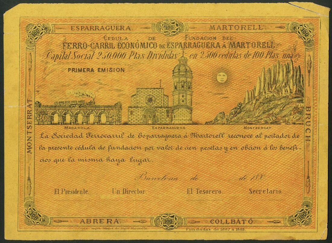 Spain: Ferro-Carril Económico de Esparraguera á Martorell, an unissued 'cedua' for 100 pesetas, 188-, ornate design with steam train, buildings and mountains, black with orange-brown underprint. Corners chipped and a couple of edge tears but a rare piece.