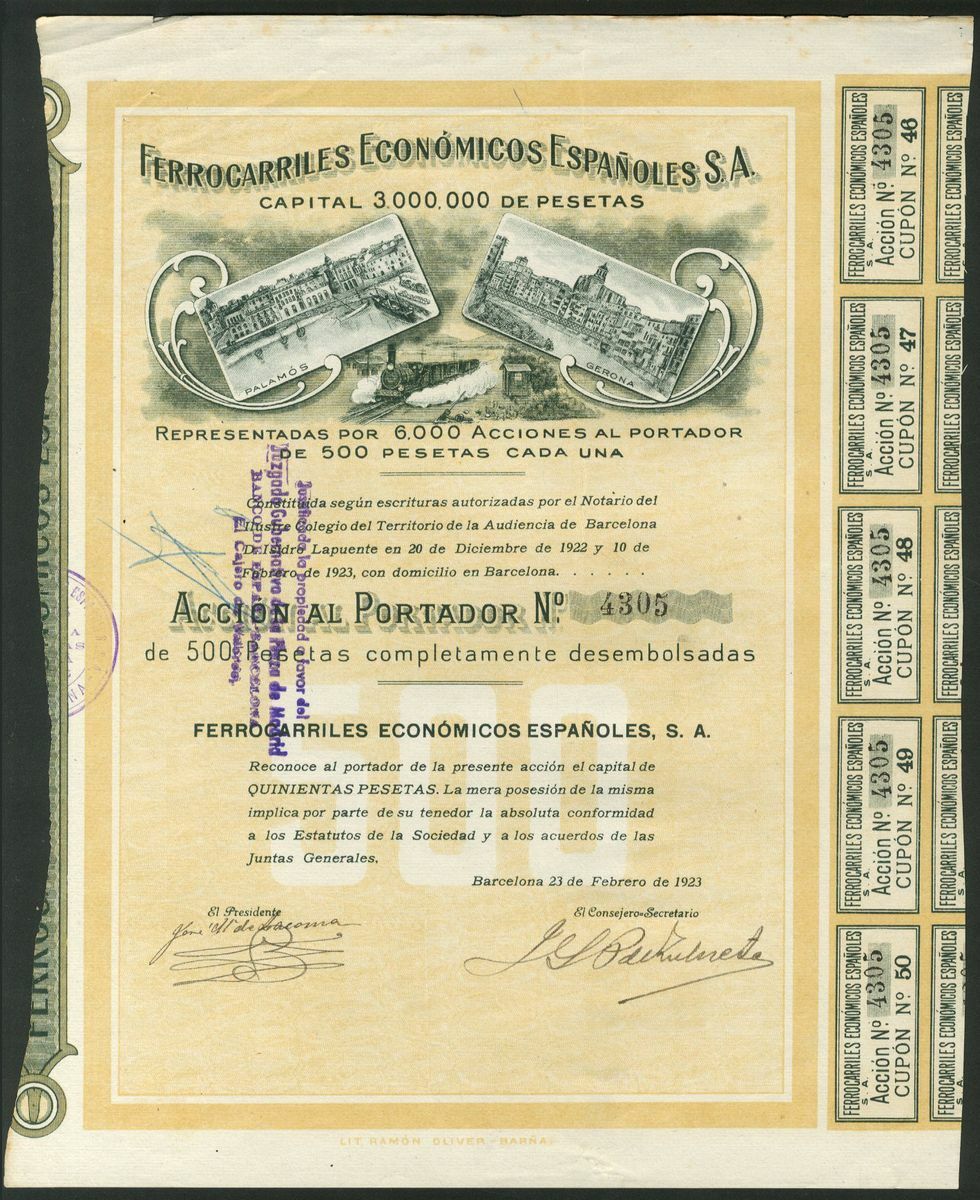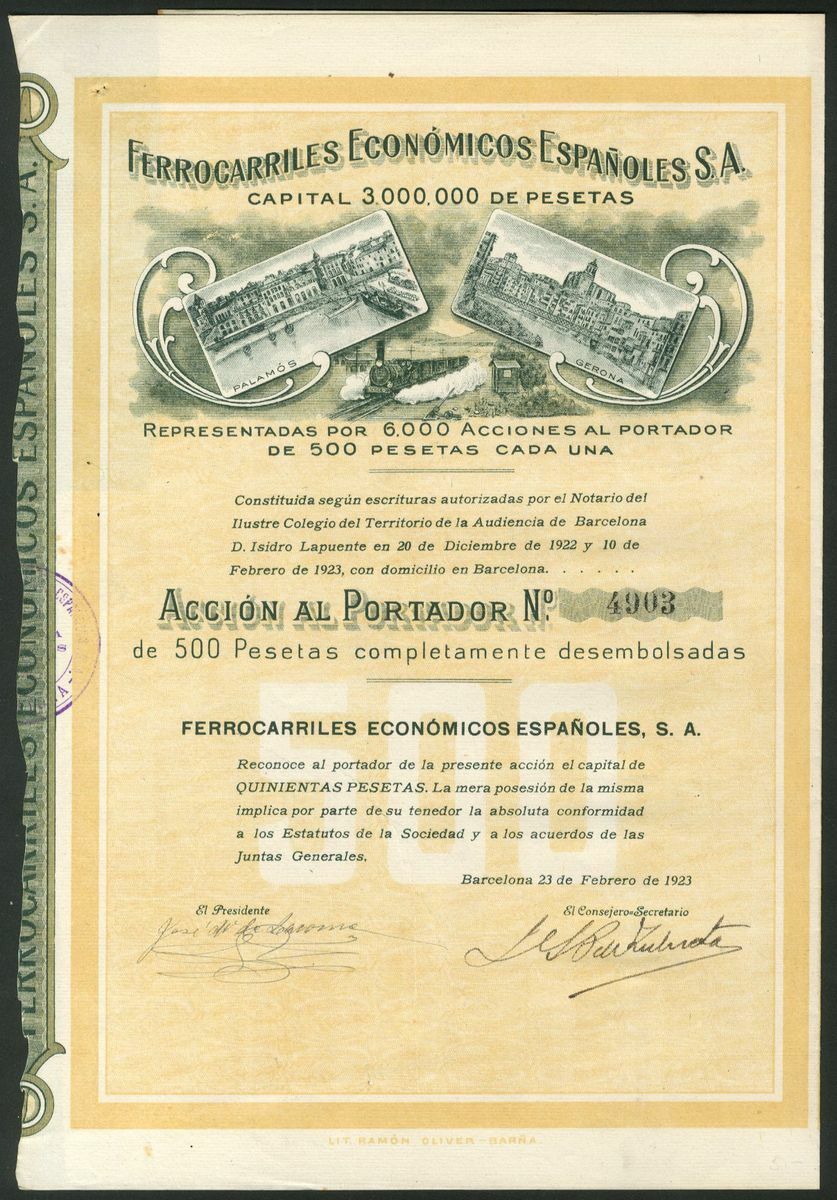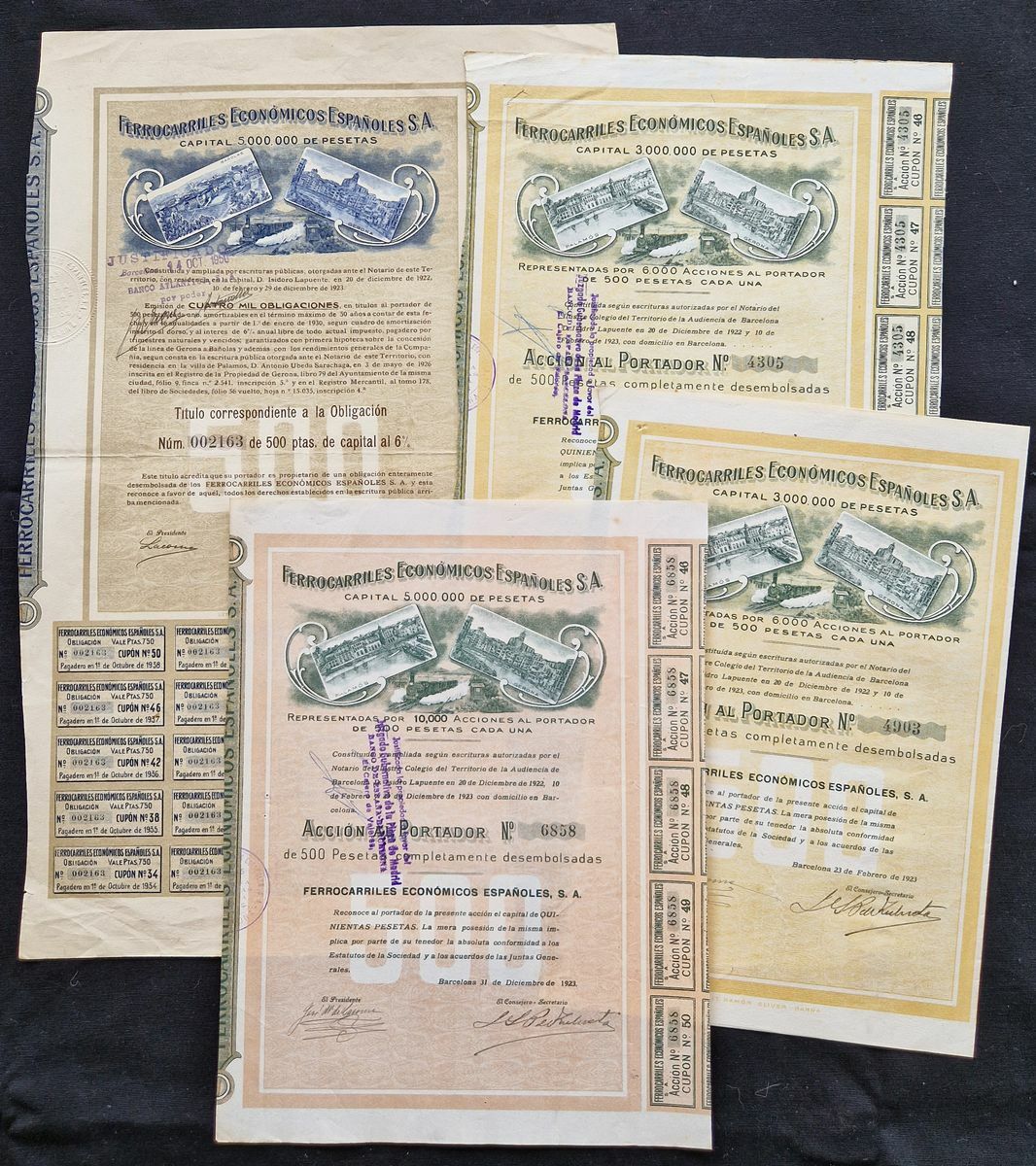 Spain: Ferrocarriles Económicos Españoles S.A., 500 peseta share, February 1923, 2 examples, 1 with handstamp, #4305 and the other without, #4903, another dated December 1923, after capital increase, #6858, together with a 6% bond for 500 pesetas, 1926, all with coupons. Constituted in Barcelona in 1922 to acquire the Gerona to Bañolas & Palamos line from Chemins de Fer Economiques de Catalogne. Closed in 1955. VF and better (4).