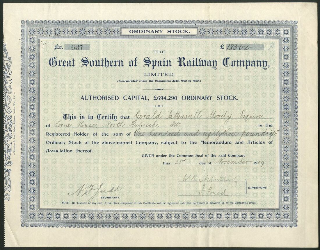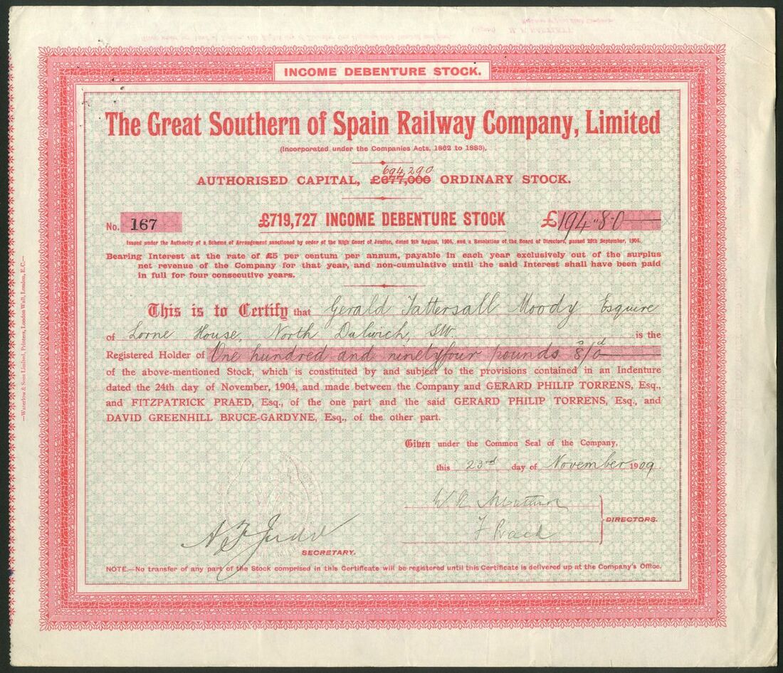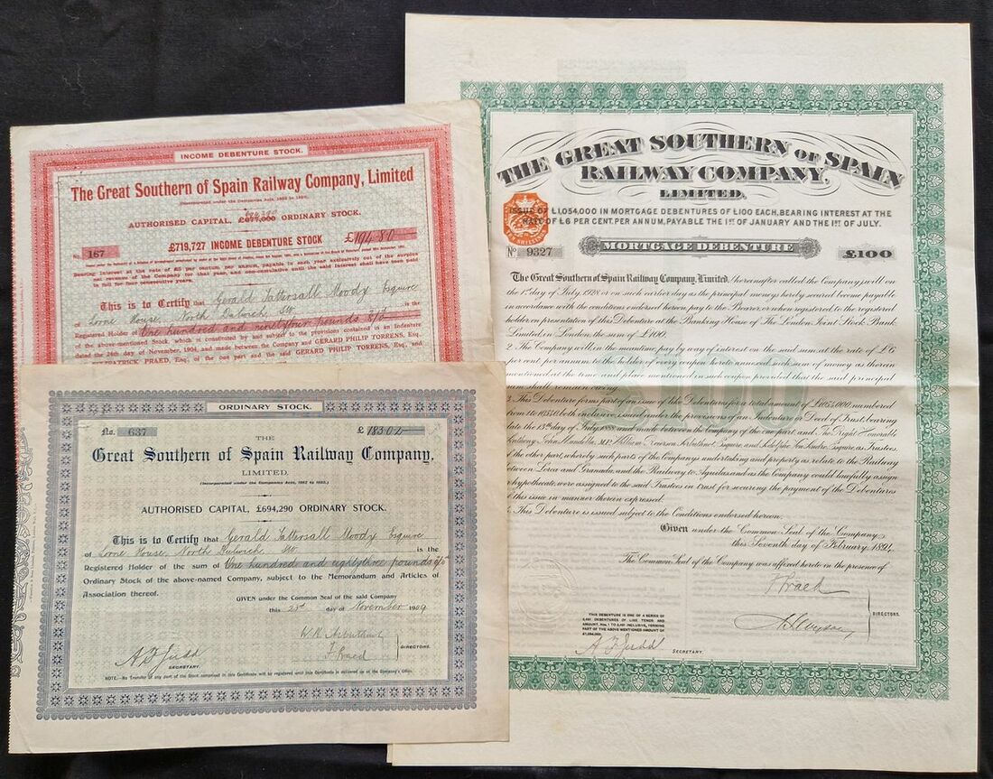 Spain: Great Southern of Spain Railway Company Limited, £100 Mortgage Debenture, 1894, #9327, large format, green and black, printed by Waterlow & Sons, rare. Together with an ordinary stock certificate, 19[09], #637, blue and Income Debenture stock, 19[09], #167, red, blue underprint, both printed by Waterlow & Sons. Registered in London in 1885. Acquired by RENFE in 1941. The first EF, the others VF (3).