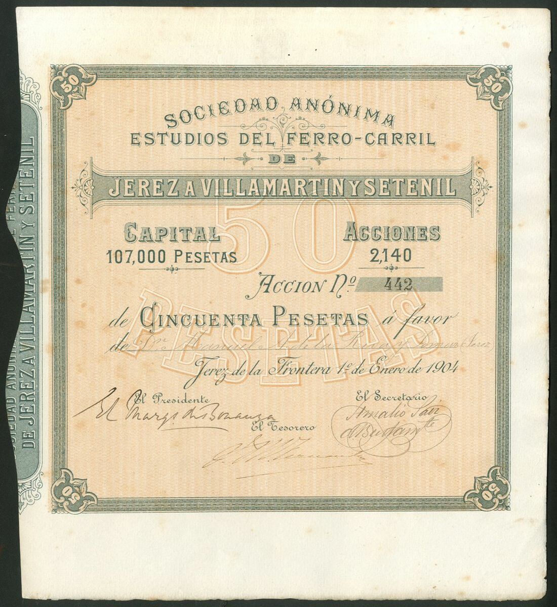 Spain: Sociedad Anónima Estudios del Ferro-Carril de Jerez a Villamertin y Setenil, 50 peseta share, 1904, #442, green with yellow underprint. EF.
