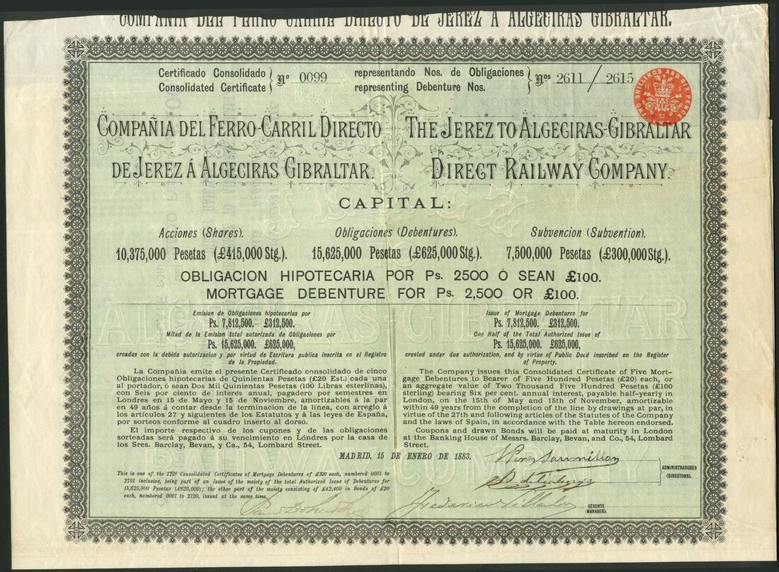Spain: Jerez to Algeciras-Gibraltar Direct Railway Company, £100 mortgage bond, Madrid 1883, #0099, text in English and Spanish and issued mainly for the London market, black, green underprint, with coupons. Constituted in Madrid in 1880 to operate a line from Bobadilla to Algeciras. Reconstructed in 1888 as Algeciras (Gibraltar) Railway Co. Ltd. VF and scarce.