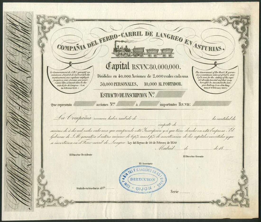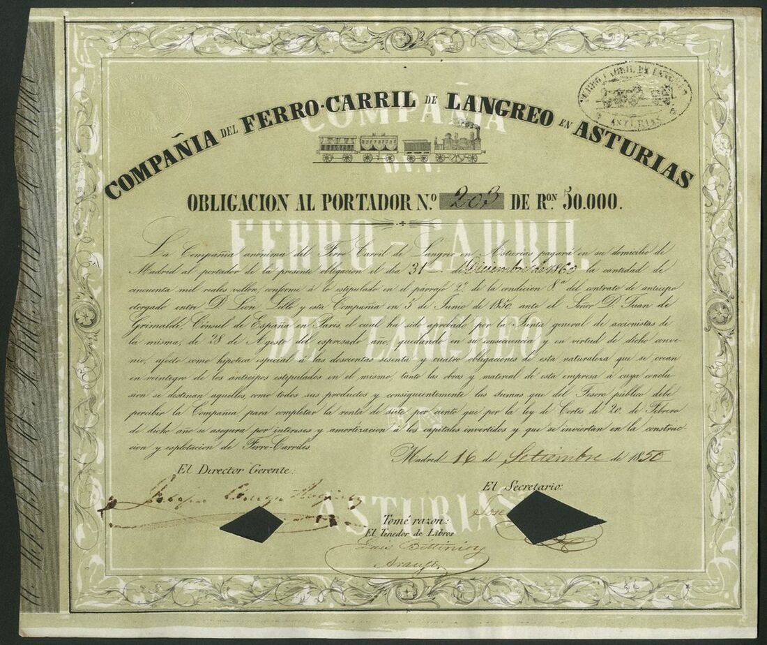 Spain: Compañia del Ferro-Carril de Langreo en Asturias, bond for 50,000 reales vellon, Madrid 18[50], #203, of only 264 issued, early train at top, black with green underprint, hole cancelled. Together with an unissued certificate for personal shares, undated but circa 1850, steam train at top, black. Constituted in Madrid in 1847 and reconstituted in 1850. A unique 4 foot gauge line around Gijon that operated until the 1960's. EF (2).
