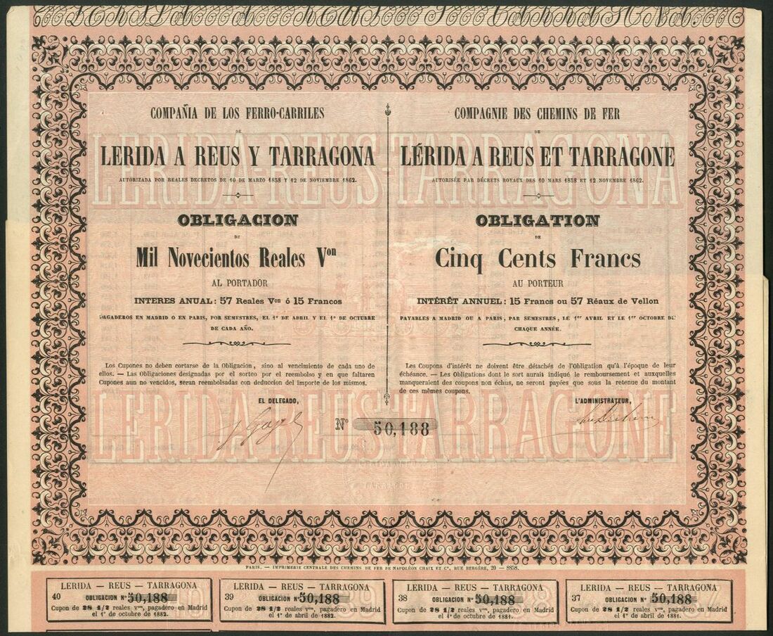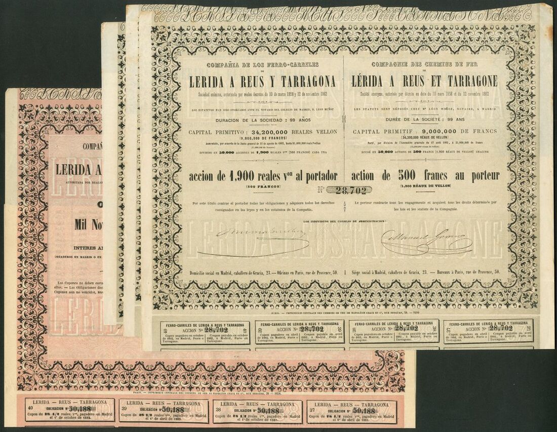 Spain: Compaña de los Ferro-Carriles de Lerida a Reus y Tarragona, 1900 reales vellon share, 1862, 3 examples, #28702, #28706 and #28831, black, grey-green underprint, with coupons, together with a 3% bond, 1862, #50188, black, pink underprint, with coupons. Constituted in 1858 as Cia del Ferro-Carriles de Reus a Montblanch. Name changed n 1862 on acquisition of a line from Tarragona to Reus and Lerida to Montblanch. Acquired by Ferro-Carriles del Norte in 1884. VF and better (4).