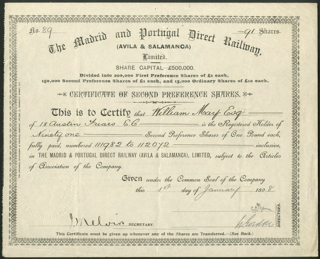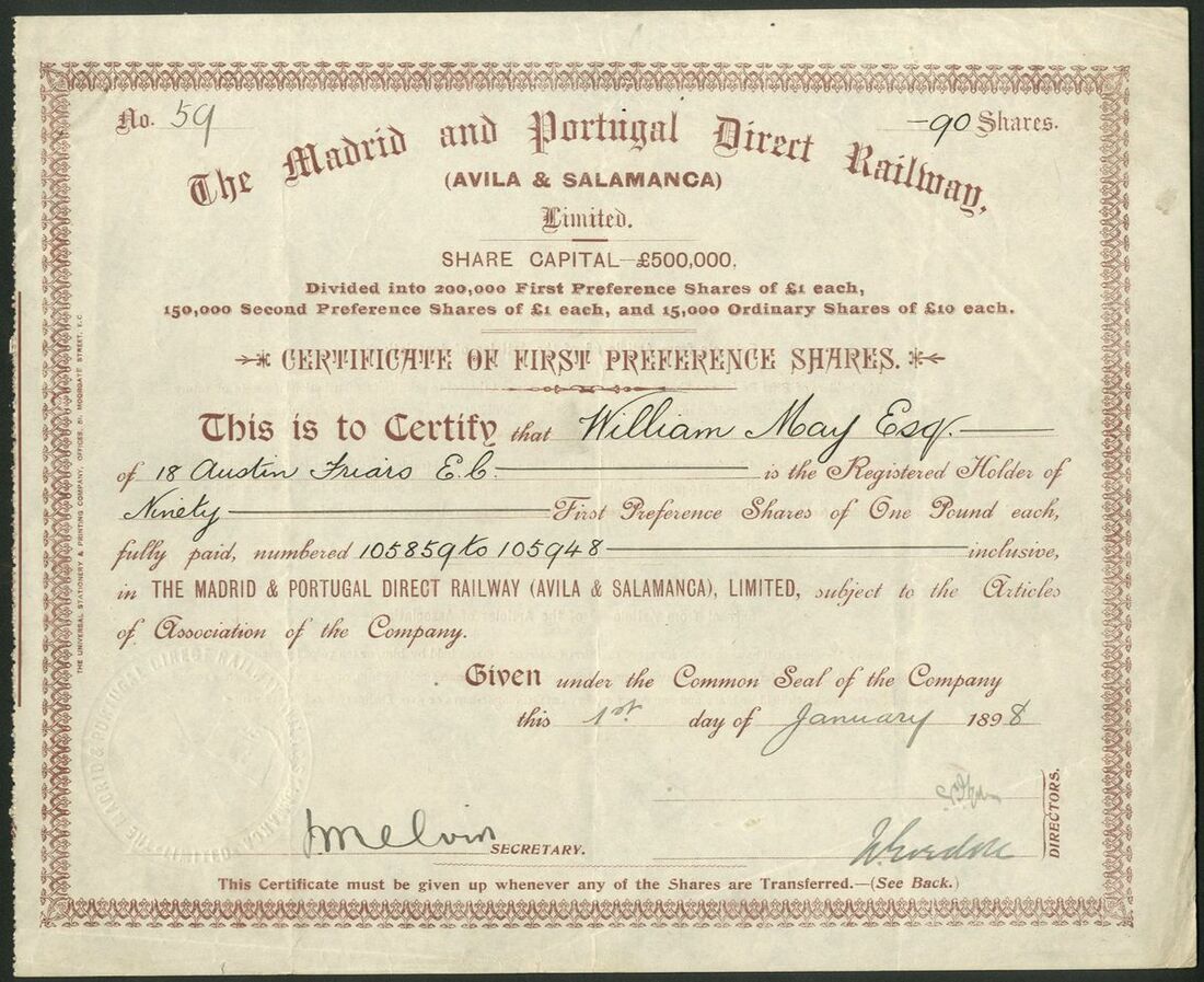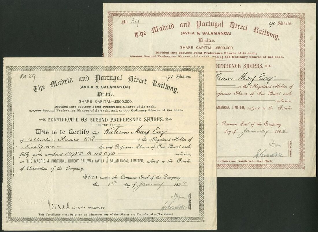 Spain: Madrid and Portugal Direct Railway (Avila & Salamanca) Ltd., pair of certificates for first and second preference shares, both 189[8], brown, #59 and black, #89 respectievly. Registered in London in 1887 to build a line from Avila to Salamanca to link Madrid and Oporto. Taken over by the State in 1906 and the company in liquidation by 1927. VF and rare (2)