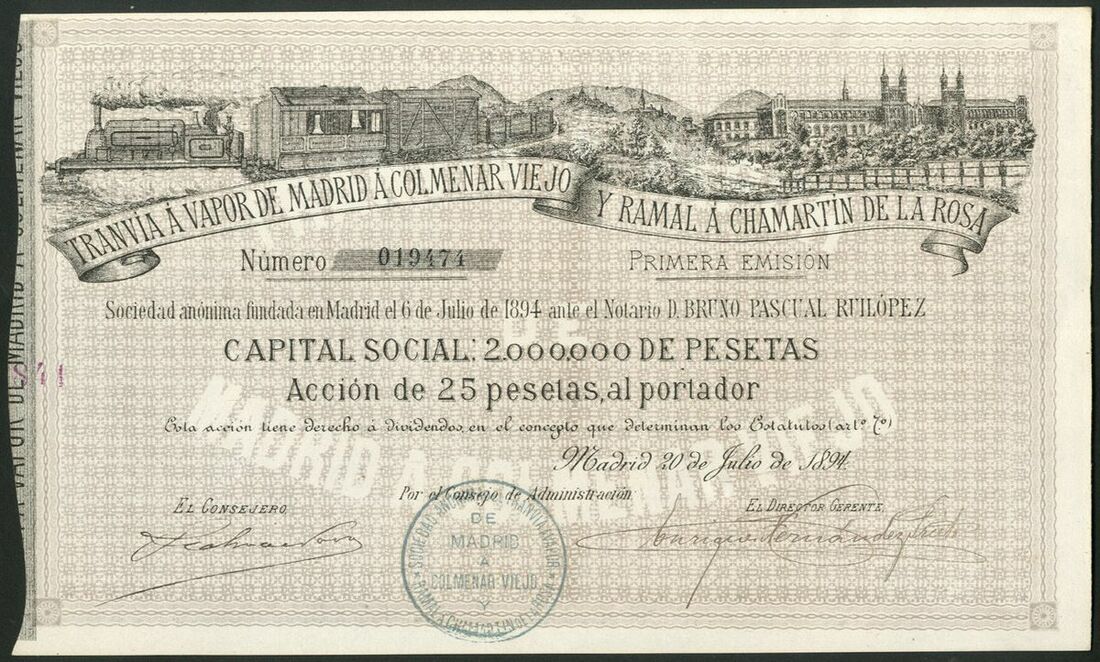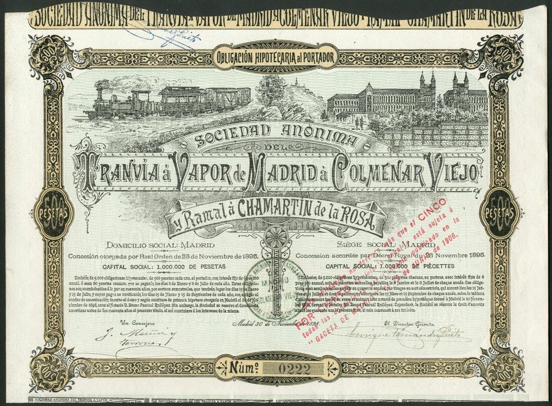 Spain: Tranvia á Vapor de Madrid á Colmenar Viejo y Ramal á Chamartin de la Rosa, 25 peseta share, 1894, #19474, attractive steam train and city view, black, grey underprint. Together with 500 peseta mortgage bond, 1898, #0222, similar vignette, brown and black with blue underprint, with coupons. A suburban line North of Madrid. Acquired by Cia Madrileña de Urbanizacion. Both EF (2).