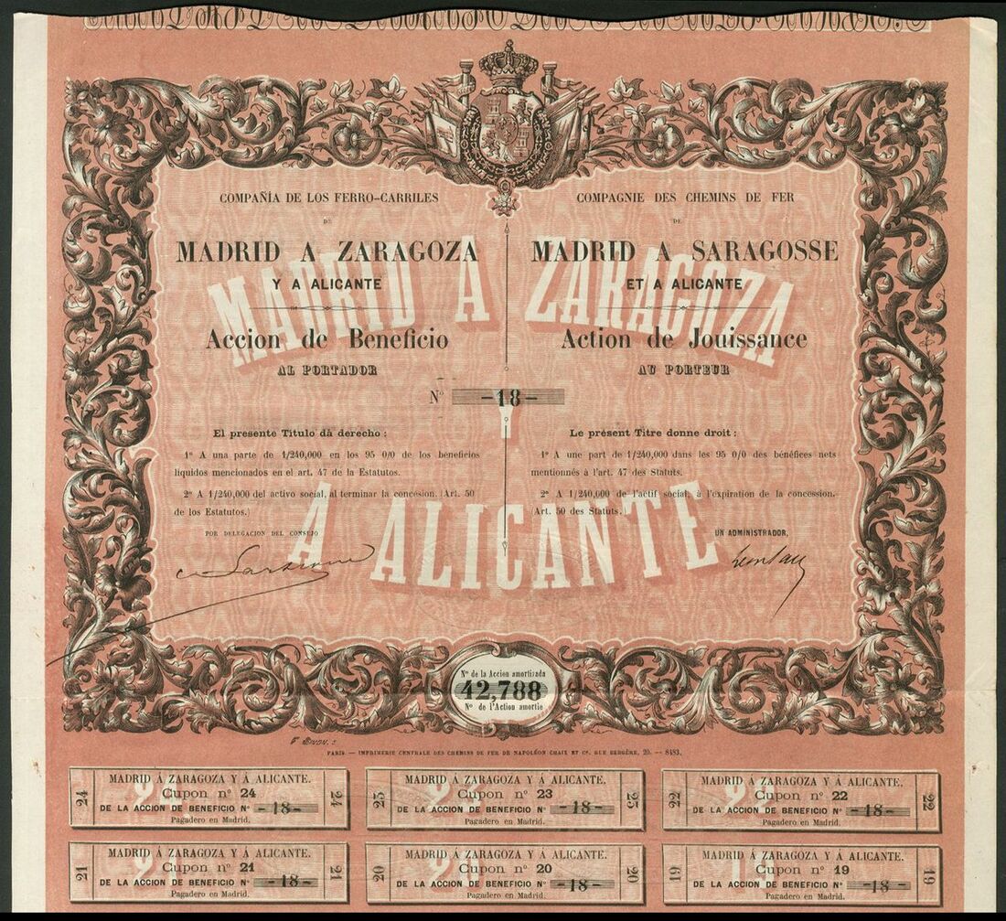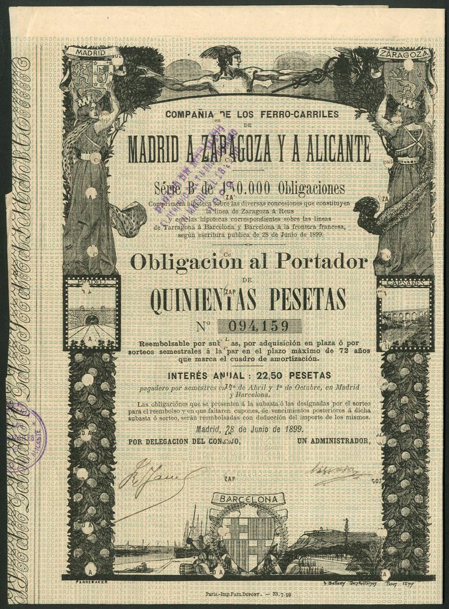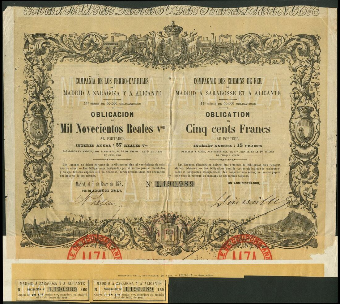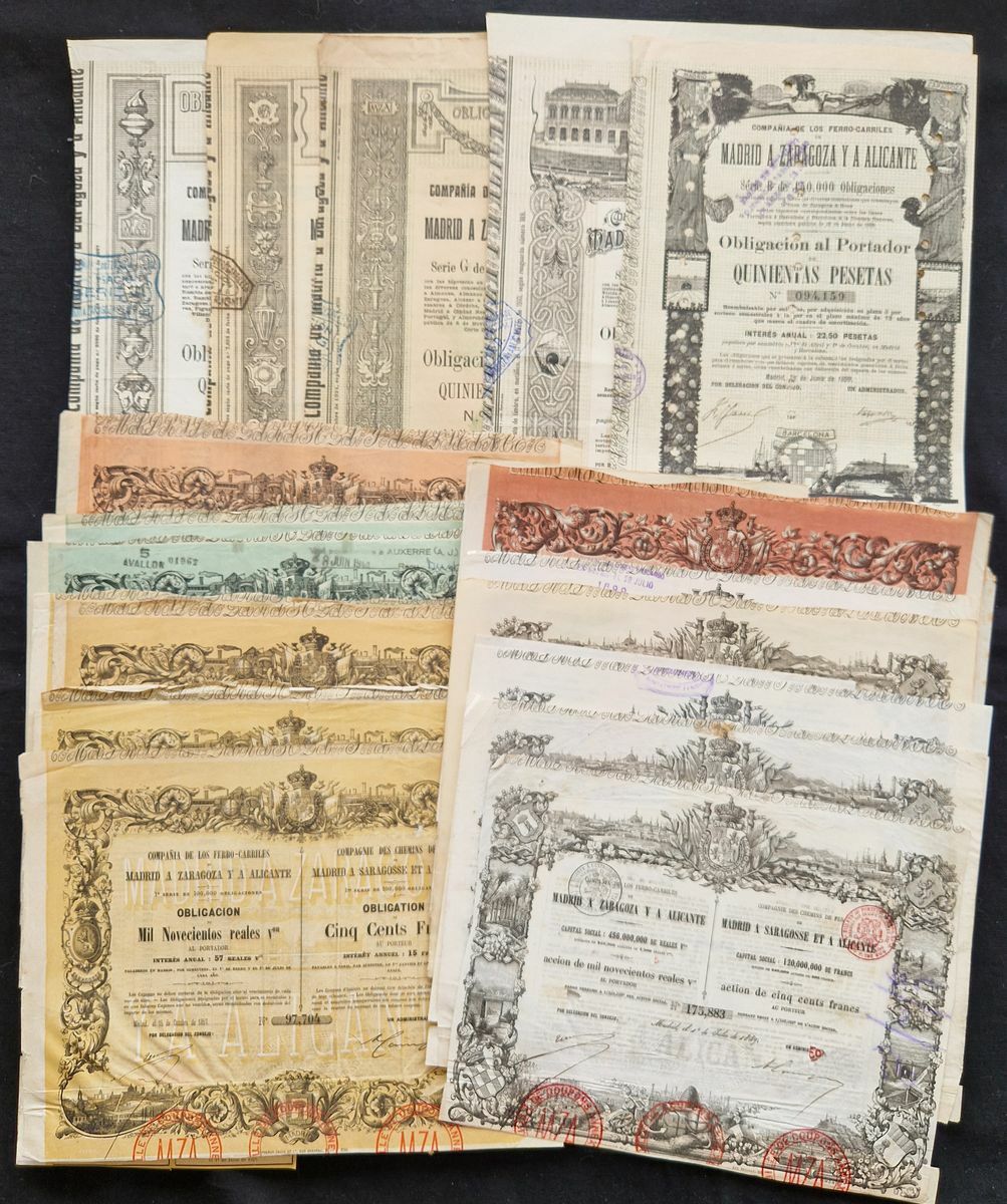Spain: Compañia de los Ferro-Carriles de Madrid a Zaragoza y a Alicante, a series of share certificates comprising 1900 reales, 1859, 2 examples, both cancelled and another but later reissue, another dated 1880, cancelled and 1899; jouissance shares, undated but circa 1859, 2 examples, black, pink underprint, with coupons, together with a large series of bonds comprising 1st series, 1857, 5th series, 1860, 6th series, 1860, 14th series, 1878, 15th series, 1880, 17th series, 1884, 19th series, 1884 and 20th series, 1885. and later issues, 1899 to 1927, many cancelled. Mixed condition but most VF and better (19).