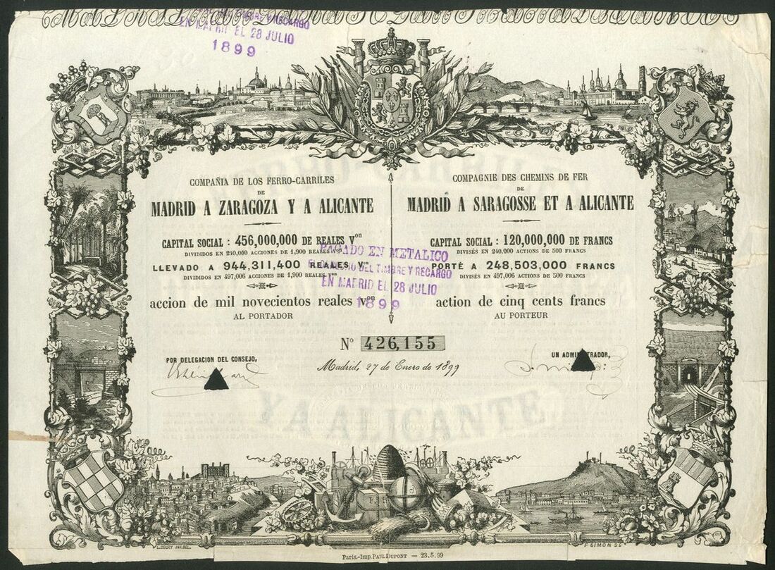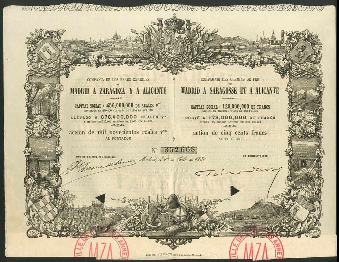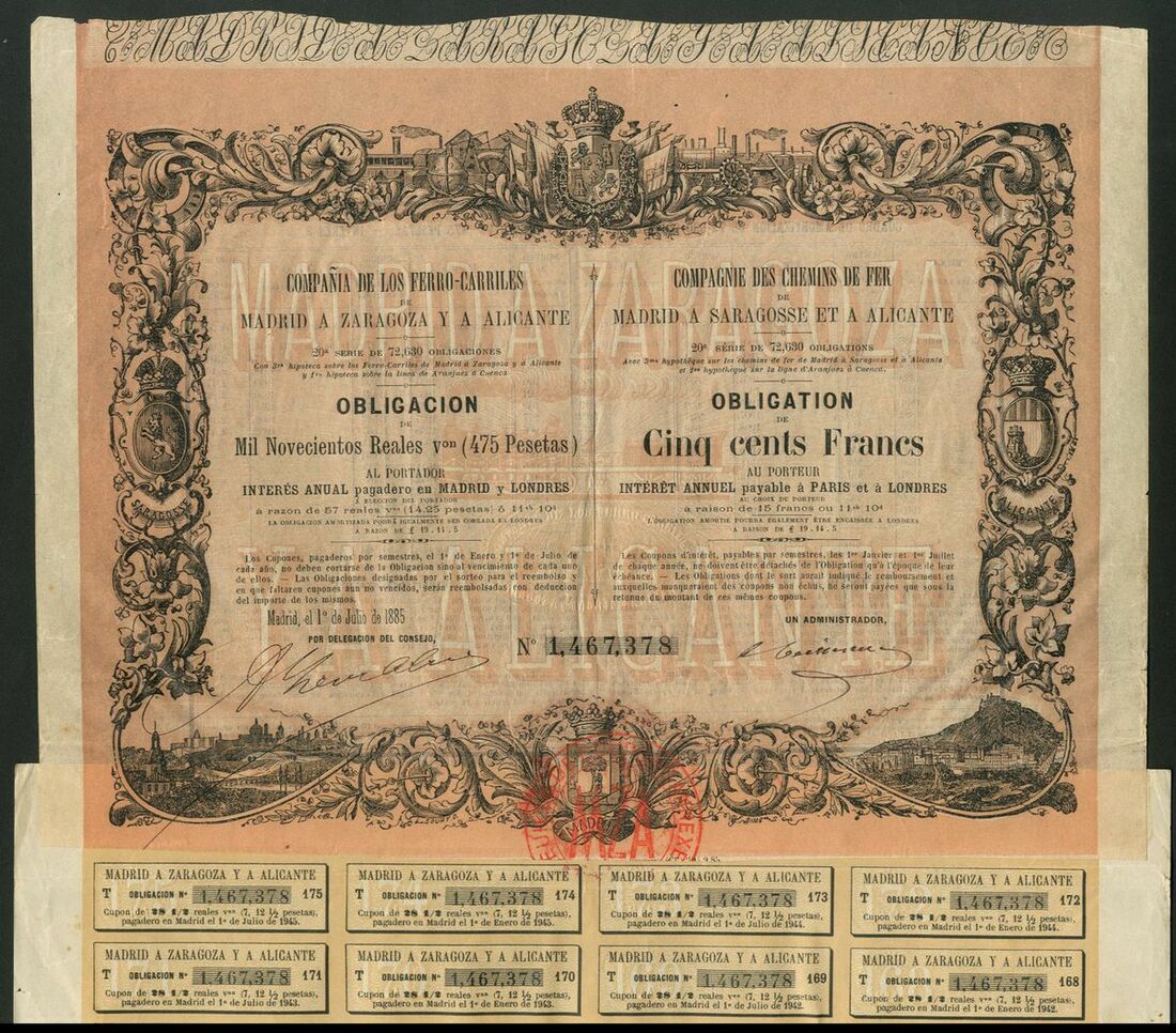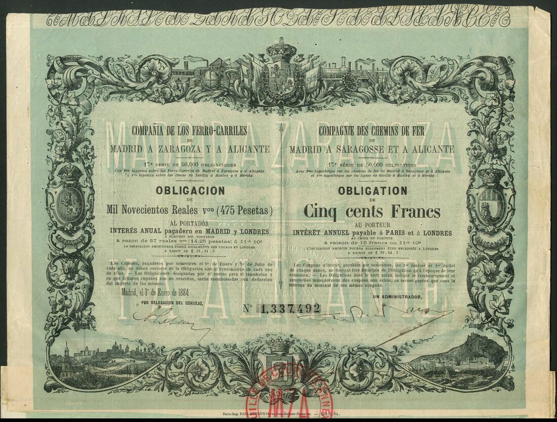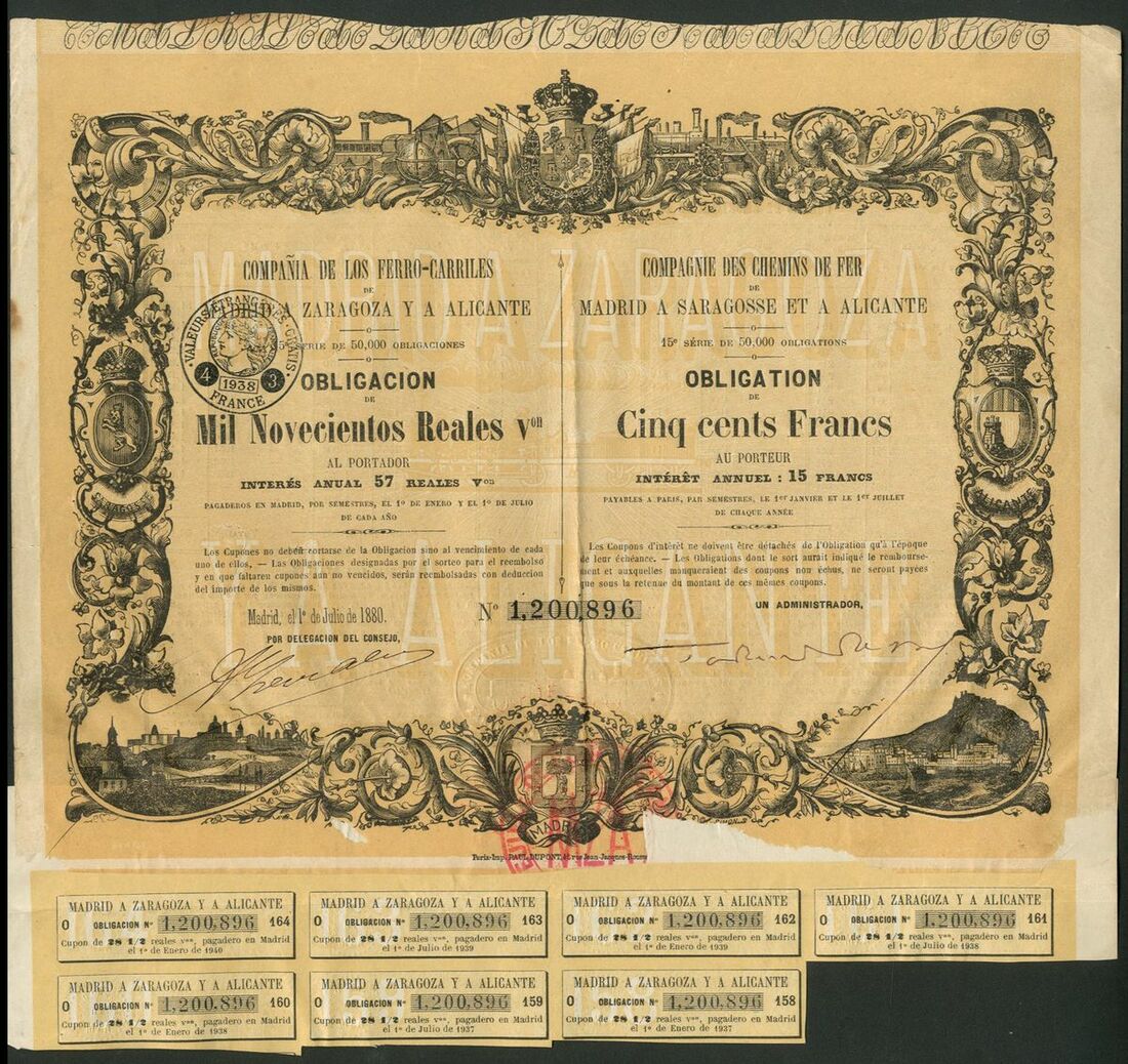 Spain: Compañia de los Ferro-Carriles de Madrid a Zaragoza y a Alicante, a series of share certificates comprising 1900 reales, 1859, 2 examples, both cancelled and another but later reissue, another dated 1880, cancelled and 1899; jouissance shares, undated but circa 1859, 2 examples, black, pink underprint, with coupons, together with a large series of bonds comprising 1st series, 1857, 5th series, 1860, 6th series, 1860, 14th series, 1878, 15th series, 1880, 17th series, 1884, 19th series, 1884 and 20th series, 1885. and later issues, 1899 to 1927, many cancelled. Mixed condition but most VF and better (19).