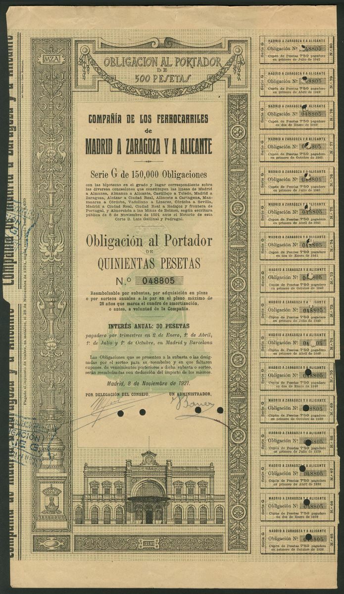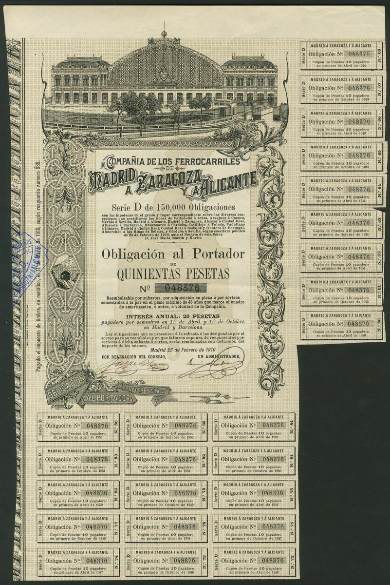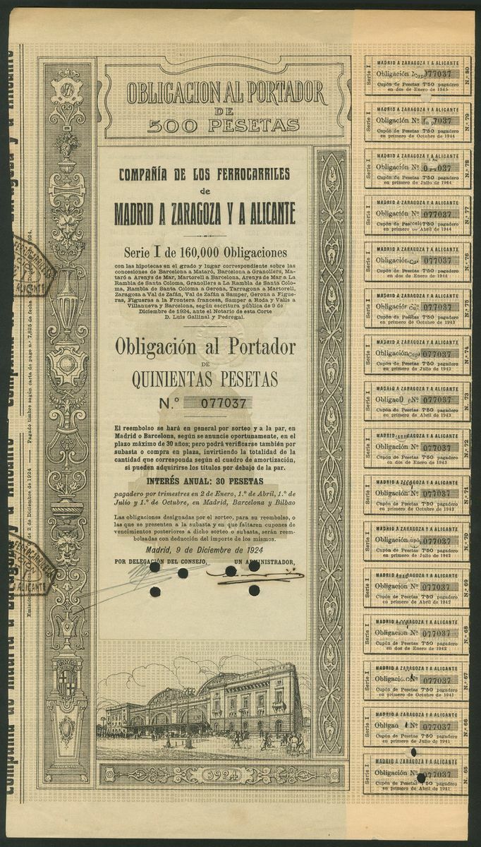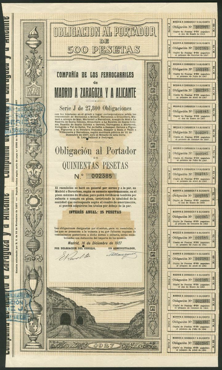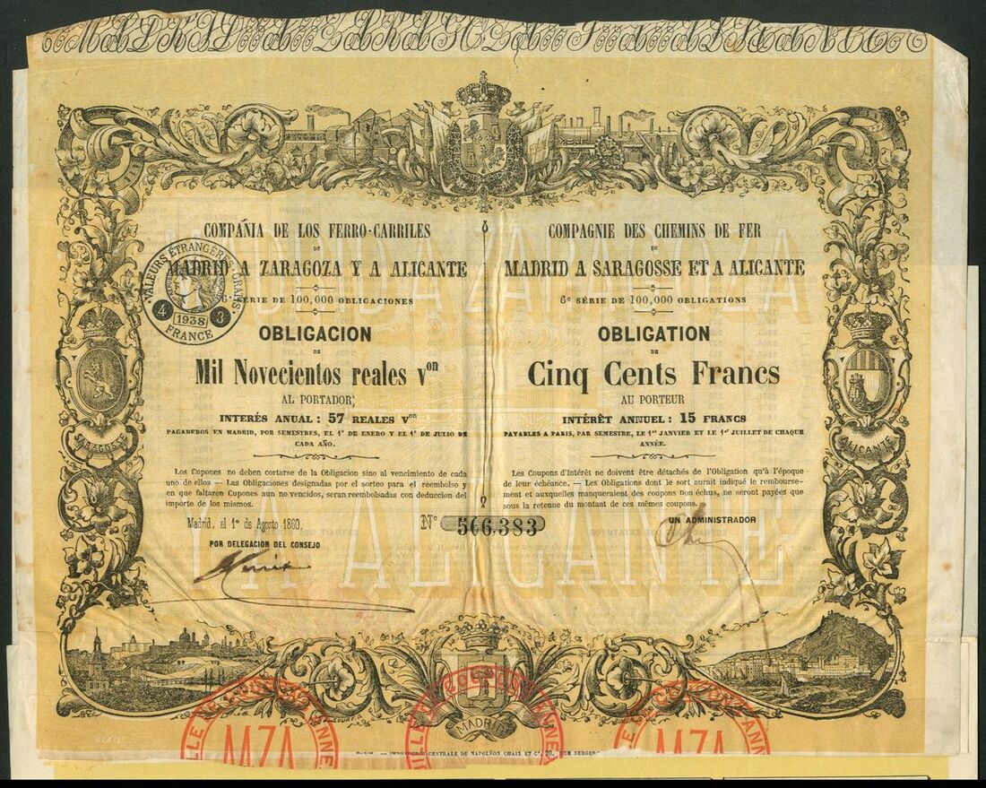 Spain: Compañia de los Ferro-Carriles de Madrid a Zaragoza y a Alicante, a series of share certificates comprising 1900 reales, 1859, 2 examples, both cancelled and another but later reissue, another dated 1880, cancelled and 1899; jouissance shares, undated but circa 1859, 2 examples, black, pink underprint, with coupons, together with a large series of bonds comprising 1st series, 1857, 5th series, 1860, 6th series, 1860, 14th series, 1878, 15th series, 1880, 17th series, 1884, 19th series, 1884 and 20th series, 1885. and later issues, 1899 to 1927, many cancelled. Mixed condition but most VF and better (19).