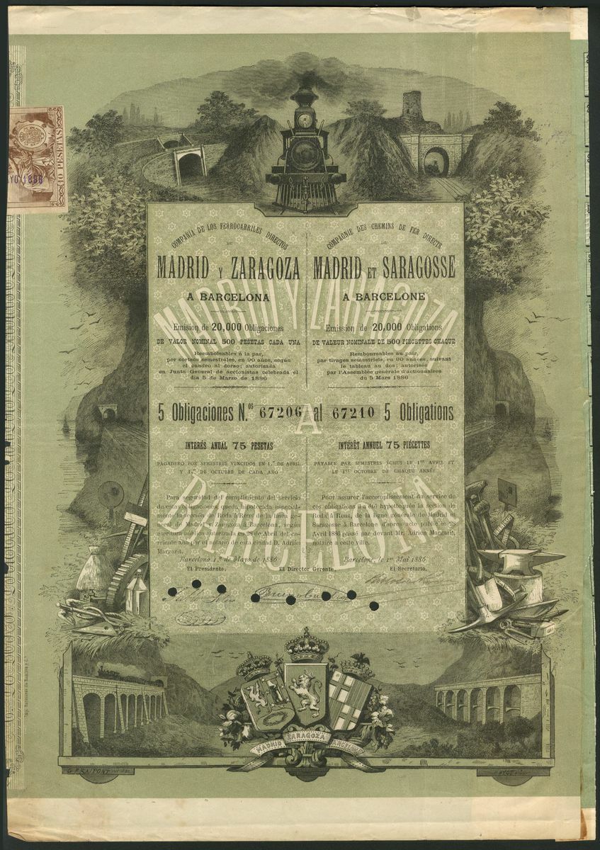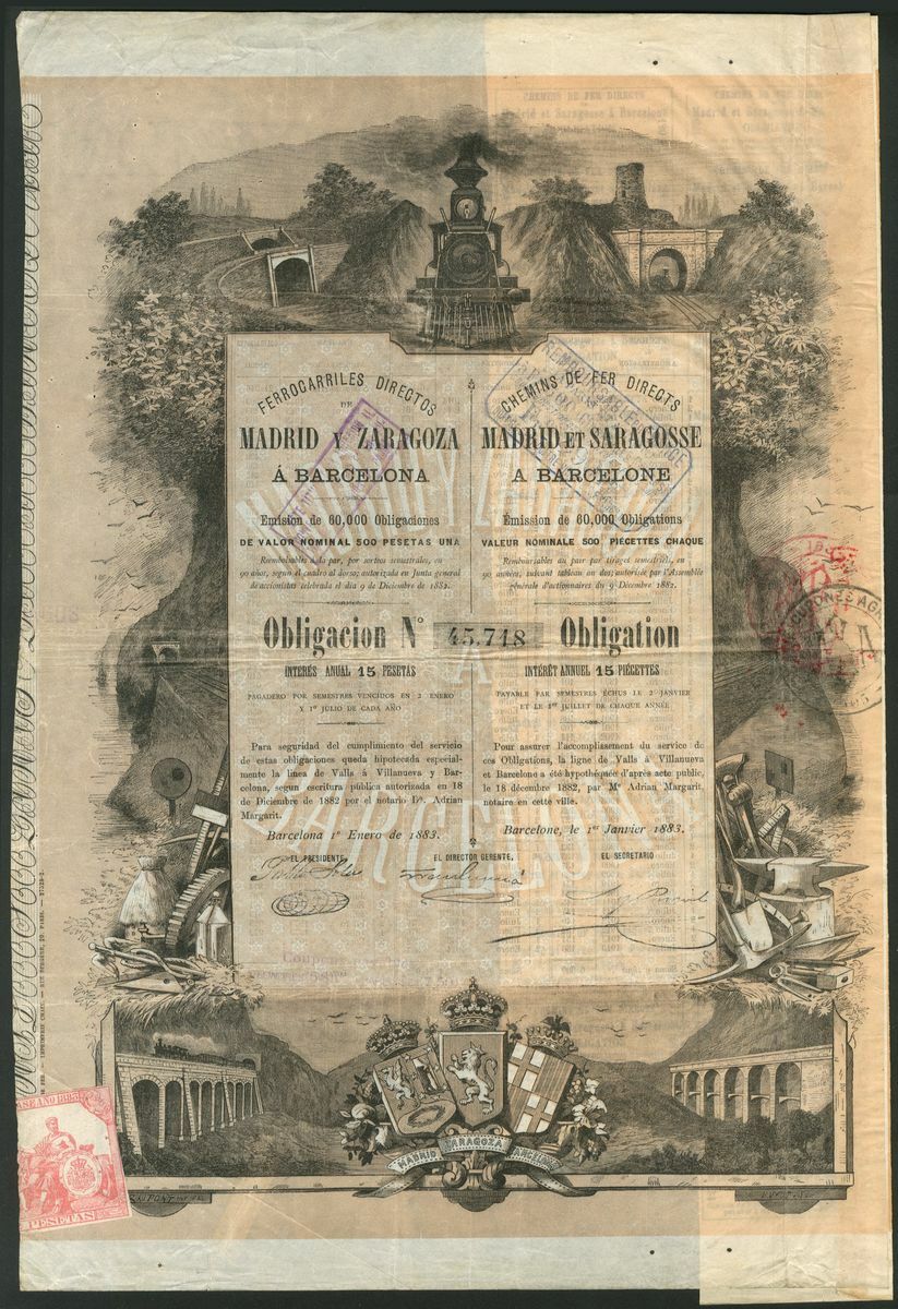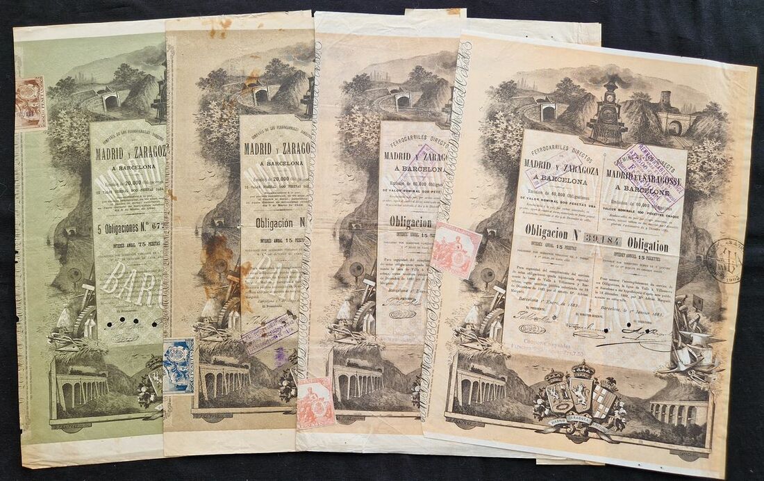 Spain: Compañia de los Ferrocarriles Directos de Madrid y Zaragoza a Barcelona, a series of obligacions comprising 3% 1883, 2 examples, 1 with hole cancels, 1 without; 3%, 1886, 1 bond, #77628 and 5 bonds, #67206-10, all of similar design with steam trains, blacksmiths tools and coats of arms, text in Spanish and French. Constituted as Ferrocarriles de Valls a Villanueva y Barcelona in 1878. Name changed in 1881. Acquired by Ferrocarriles de Tarragona a Barcelona y Francia. The 3rd with some staining, F-VF (4).