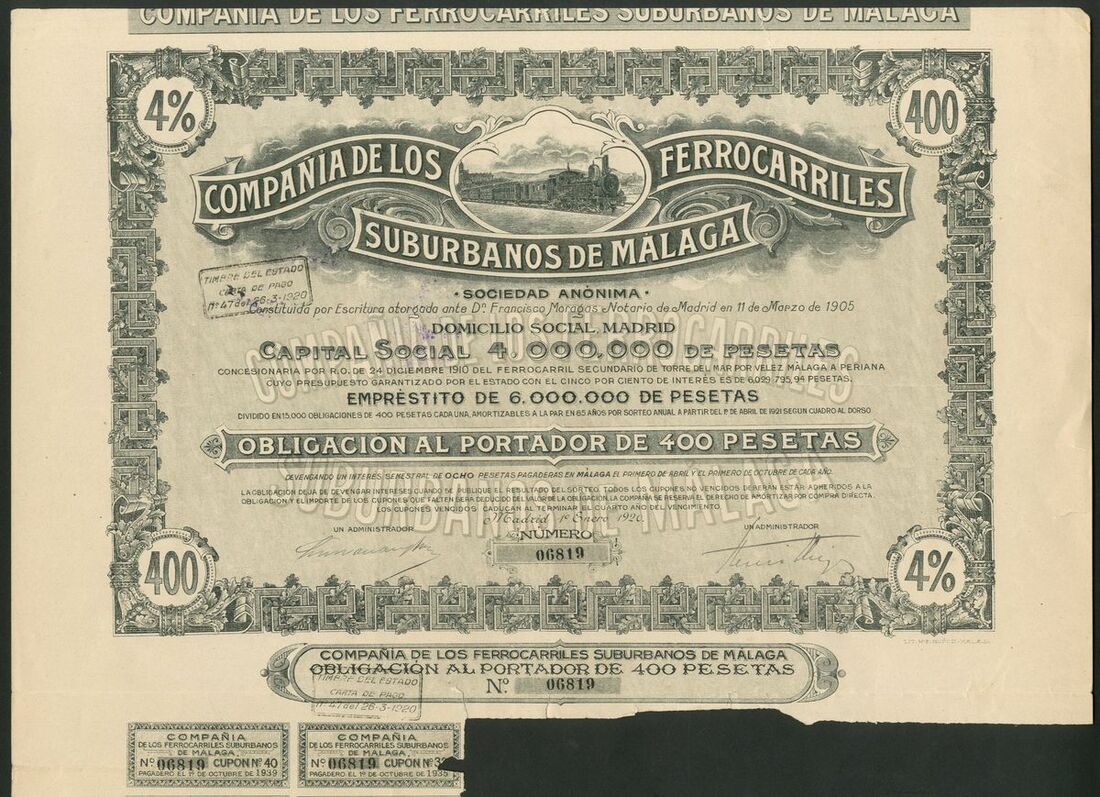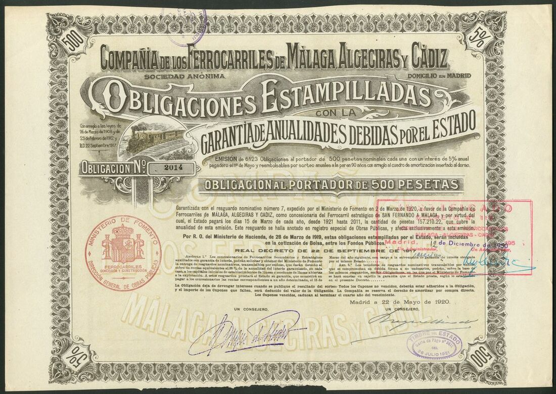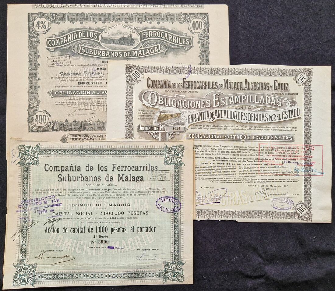 Spain: Compañia de los Ferrocarriles de Málaga, Algeciras y Cádiz, 500 peseta bond, Madrid 1920, steam train top left, brown with yellow underprint, no coupons remain. Together with Compañia de los Ferrocarriles Suburbanos de Málaga, 400 peseta bond, 1920, steam train at top, grey, with coupons, and a 1000 peseta share, 1910, #3900, green, with coupons. VF-EF (3).