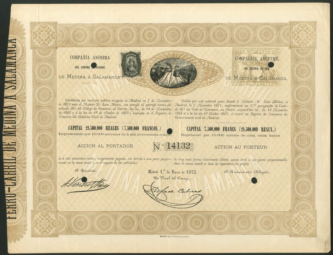 Spain: Compañia Anónima del Camino di Hierro de Medina á Salamanca, 1900 reales share, Madrid 1872, #14132, not signed by the administrator, with revenue stamps, one imprinted and one adhesive, steam railway at top, brown and black, hole cancelled. GVF.
