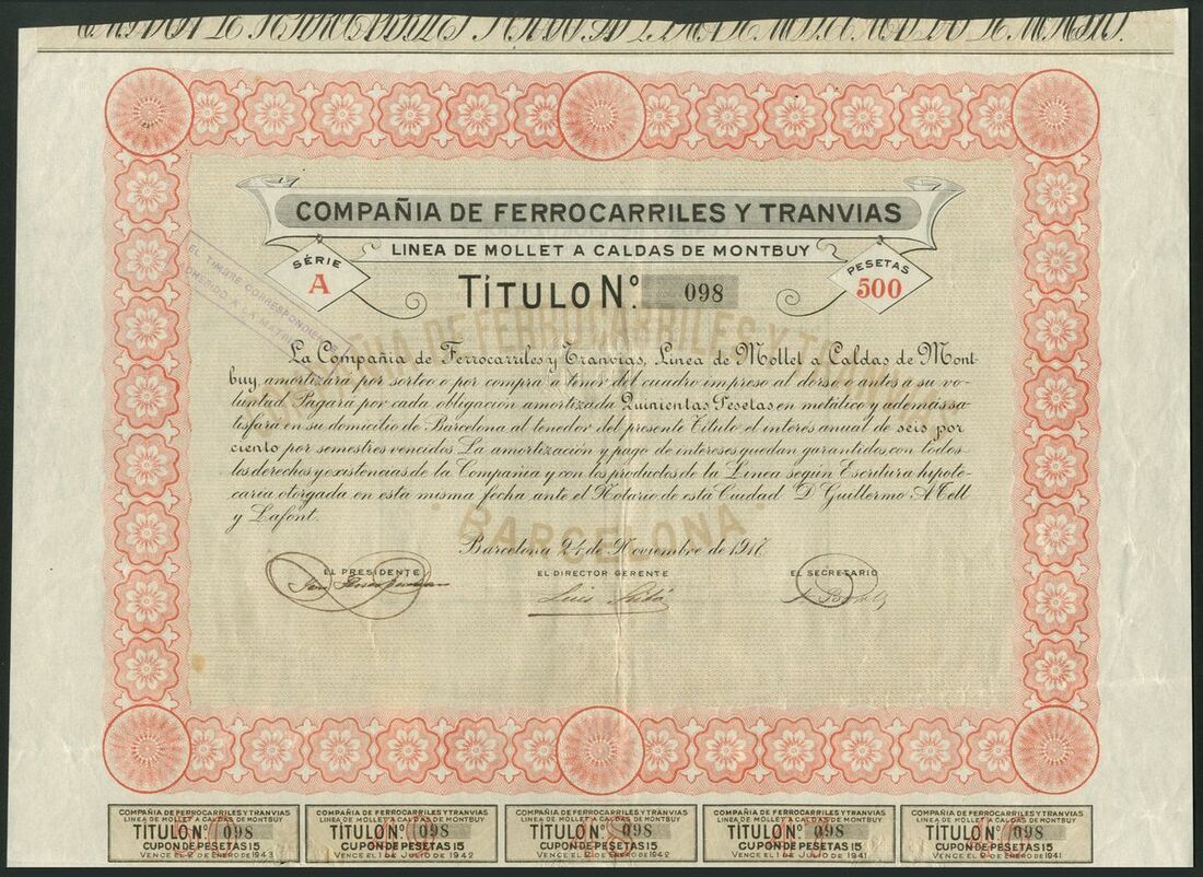 Spain: Compañia de Ferrocarriles y Tranvias, Linea de Mollet a Caldas de Montbuy, 6% bond for 500 pesetas, Barcelona 1917, #098, ornate border, red and black, with coupons. VF.