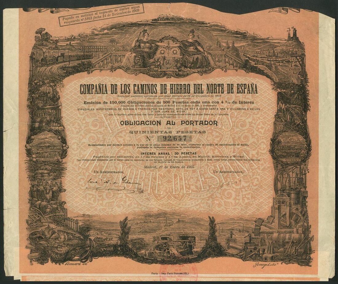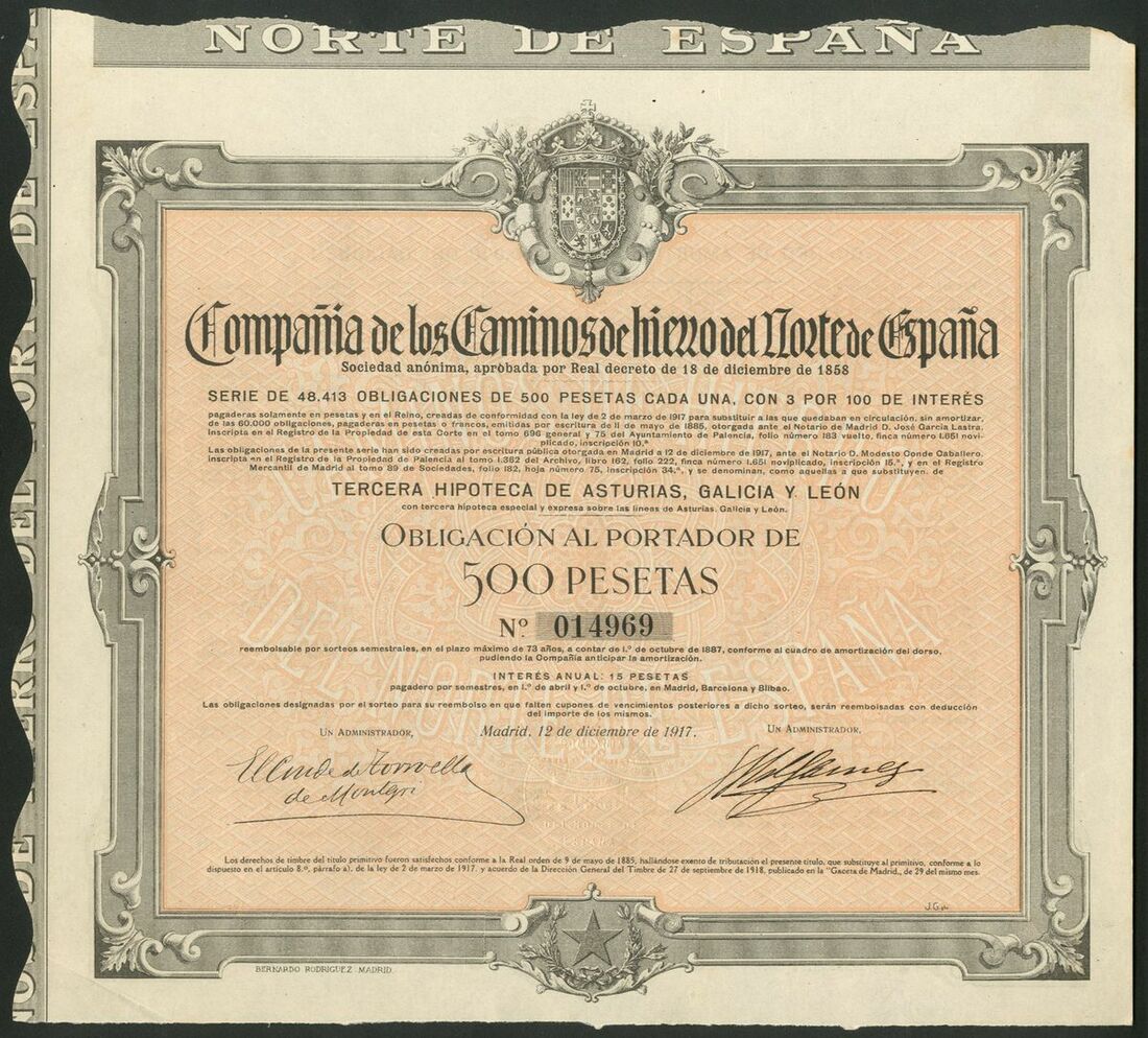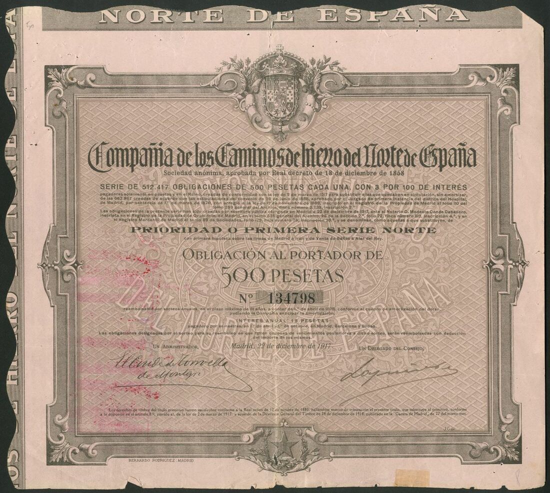 Spain: Compañia de los Ferro Carriles del Norte de España, a series of certificates comprising 'cupon de fundacion' 1860, #10386; 3% bond, 1st series, 1870, 3 examples; 2nd series, 1876; 5th series, 1888, 2 examples; 3% special bond for Ferro Carril de Zaragoza a Pamplona etc. 1878; 4% special bond for Huesca a Francia por Canfranc, 1905; a group of 1917 issues, 7 examples, 5 different; 475 peseta share, 1926, and, 'parte de fundador', 1926. Mostly VF and better but a couple of the early issues have repairs (18).