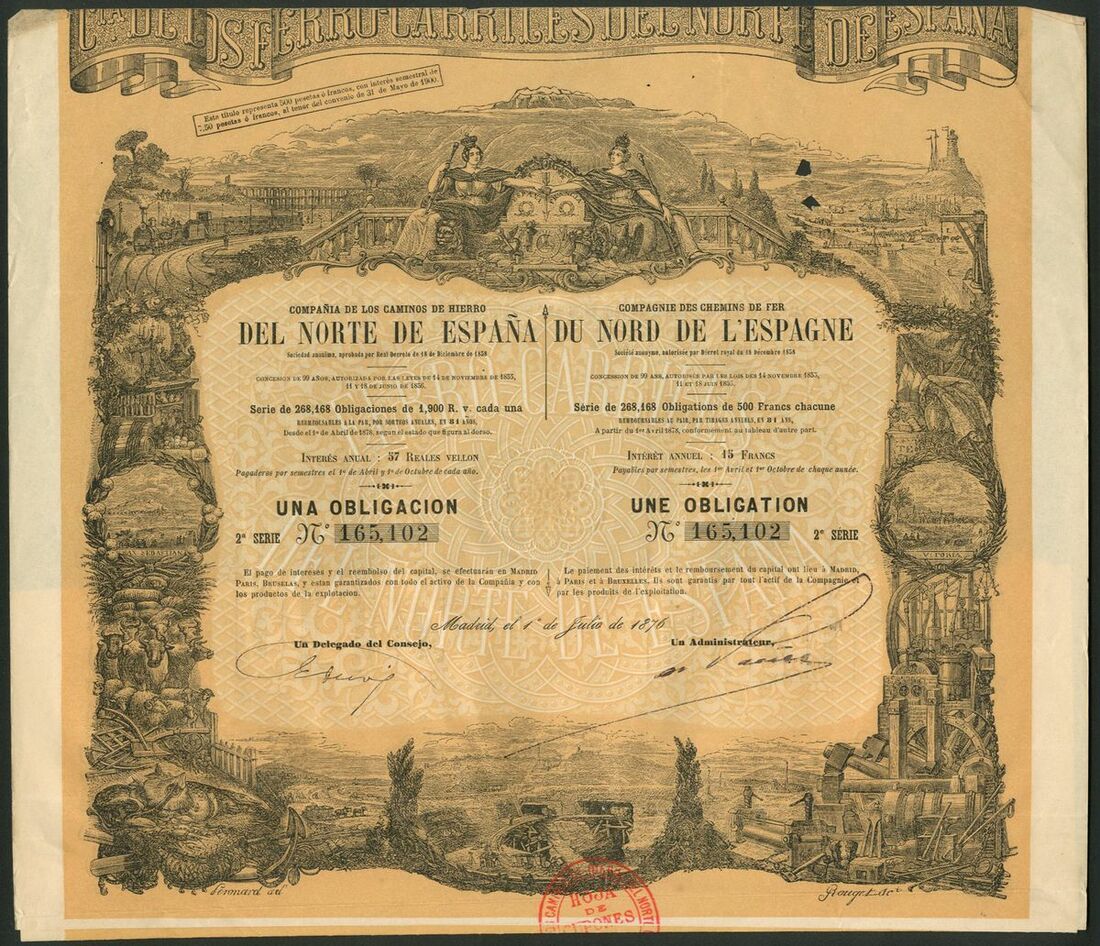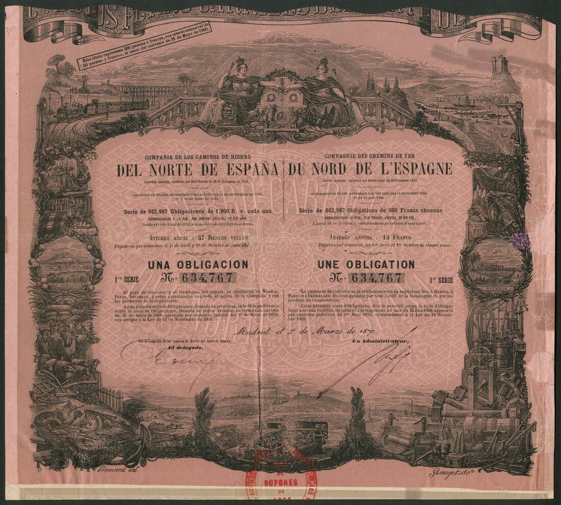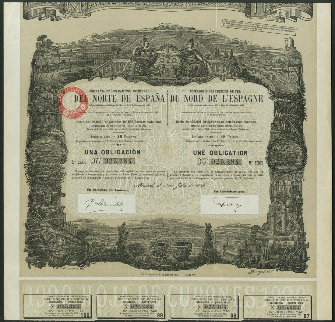 Spain: Compañia de los Ferro Carriles del Norte de España, a series of certificates comprising 'cupon de fundacion' 1860, #10386; 3% bond, 1st series, 1870, 3 examples; 2nd series, 1876; 5th series, 1888, 2 examples; 3% special bond for Ferro Carril de Zaragoza a Pamplona etc. 1878; 4% special bond for Huesca a Francia por Canfranc, 1905; a group of 1917 issues, 7 examples, 5 different; 475 peseta share, 1926, and, 'parte de fundador', 1926. Mostly VF and better but a couple of the early issues have repairs (18).