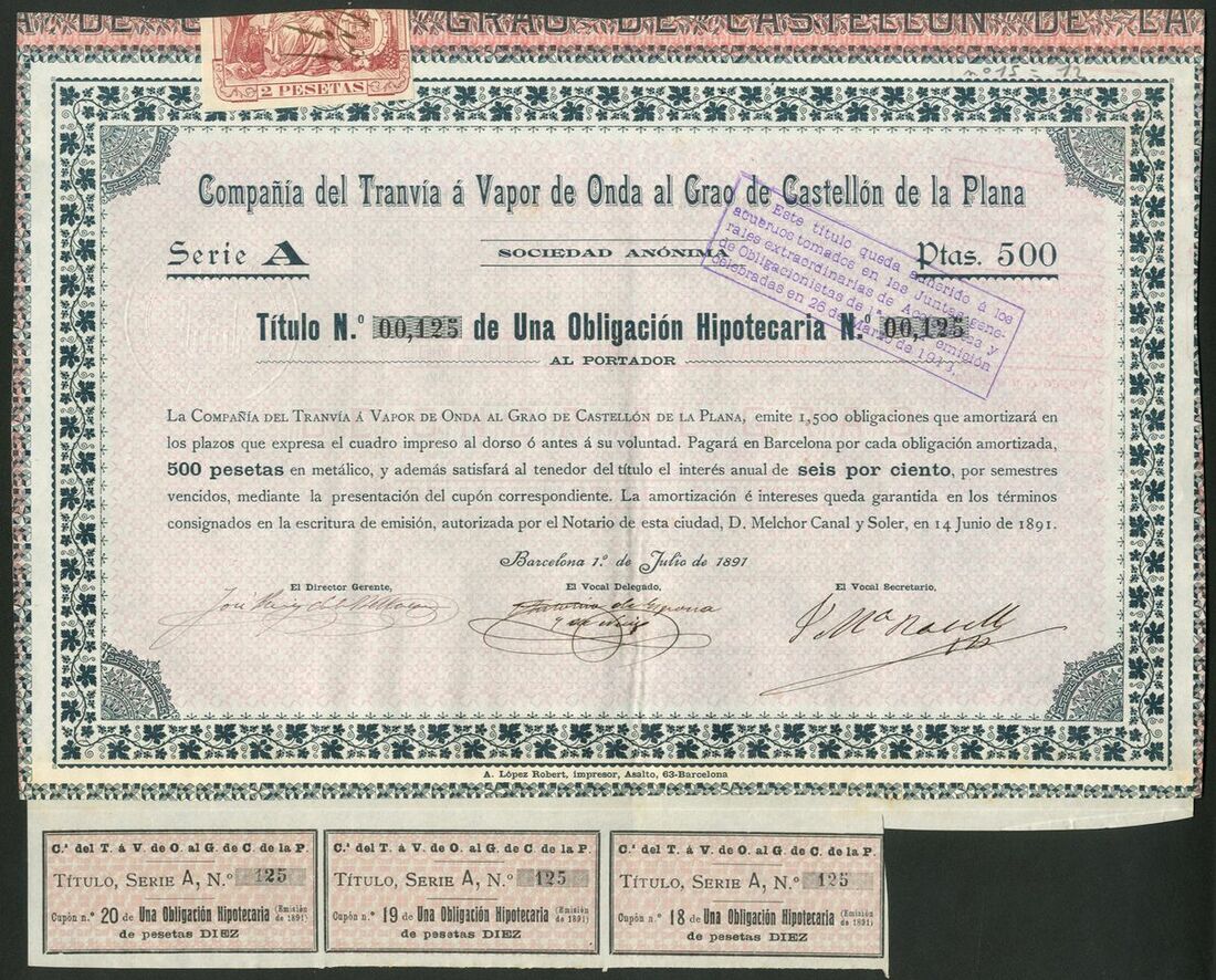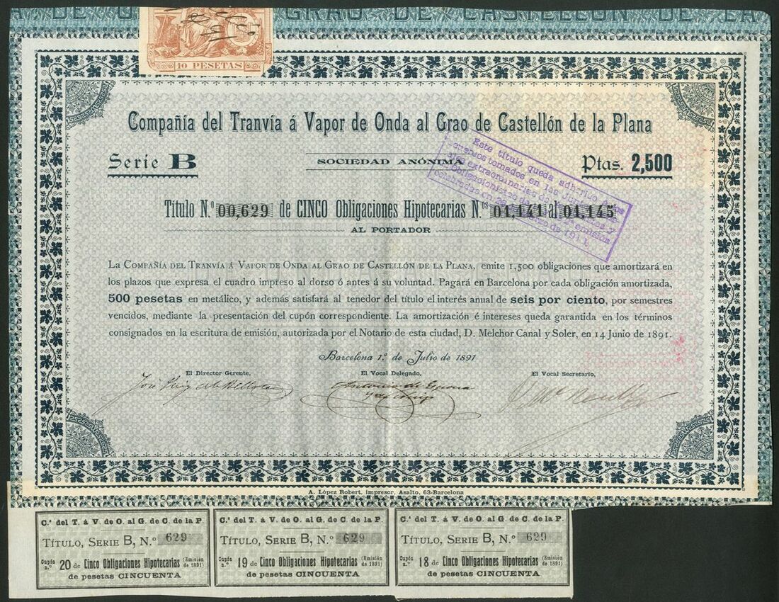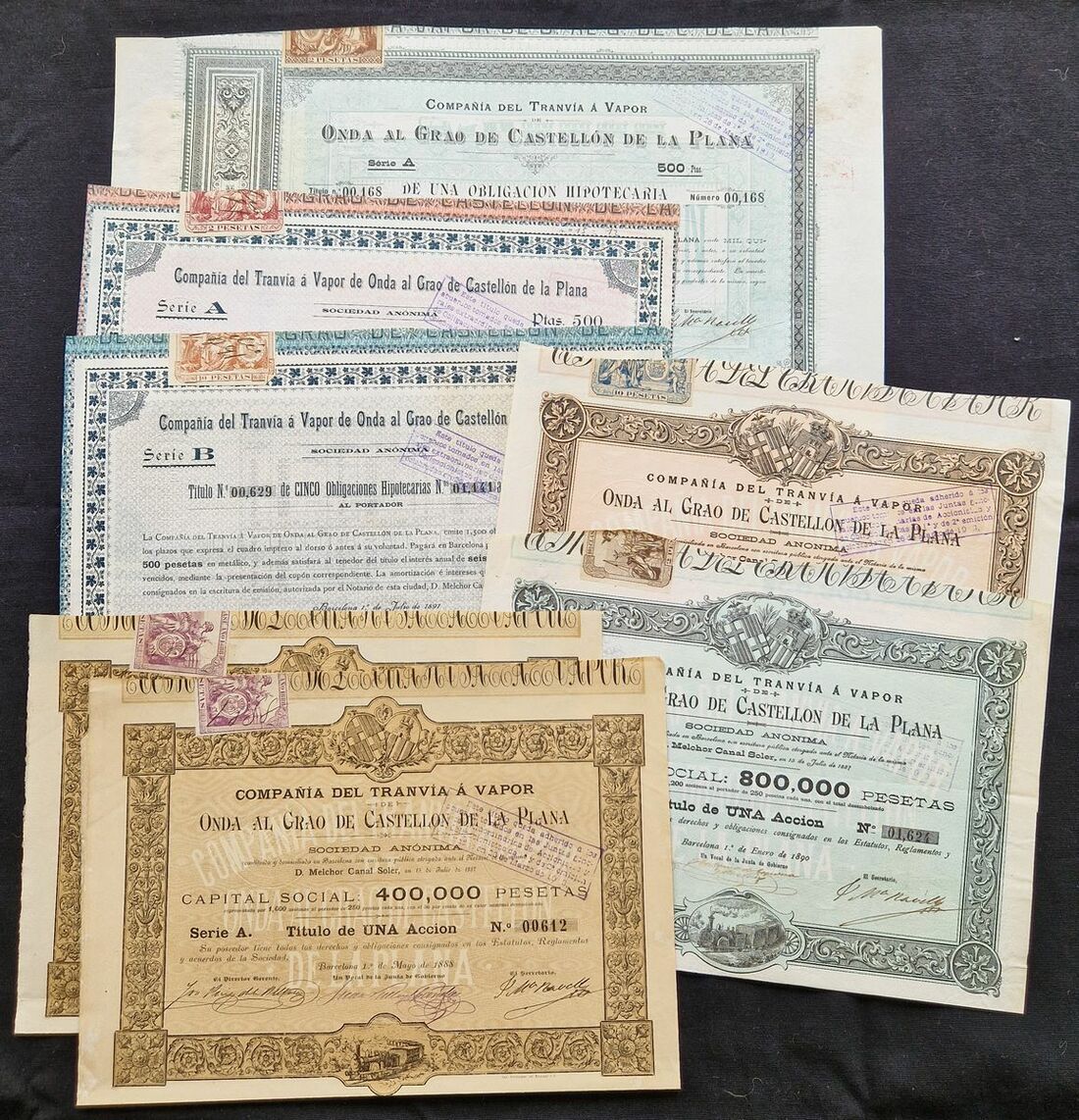 Spain: Compañia del Tranvia á Vapor de Onda al Grao de Castellon de la Plana, 250 peseta share, 1888, series A, 2 examples, #352 and #612; 250 pesta share, 1890, series B, #1624 and 5 shares, 1890, series C, #2143, all of similar design, together with mortgage bond for 500 pesetas, 1889, Series A, #00168, and, mortgage bonds, 1891, 1 bond, series A, #00125 and 5 bonds, series B, #00629, all with coupons. VF and EF (7).