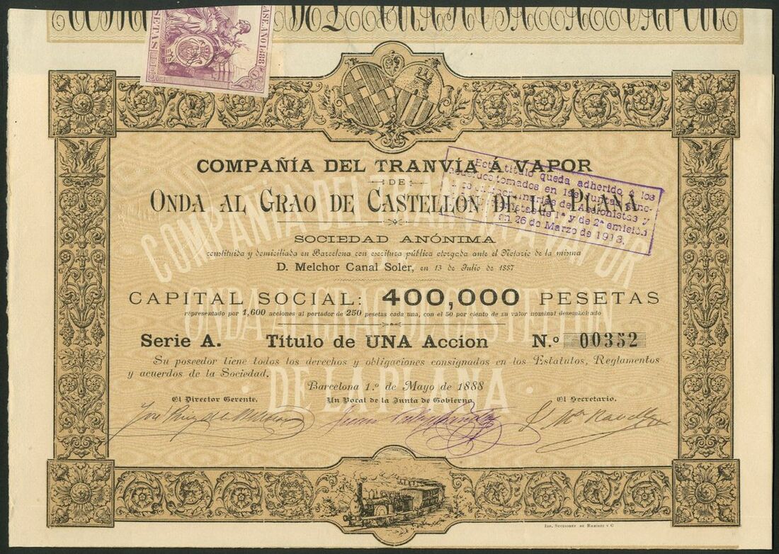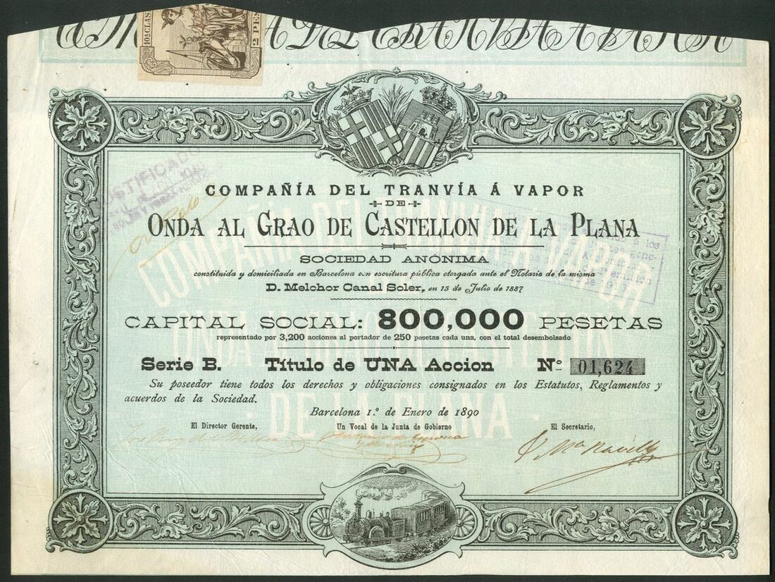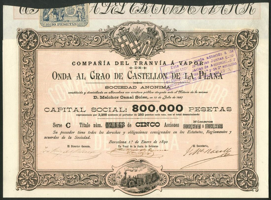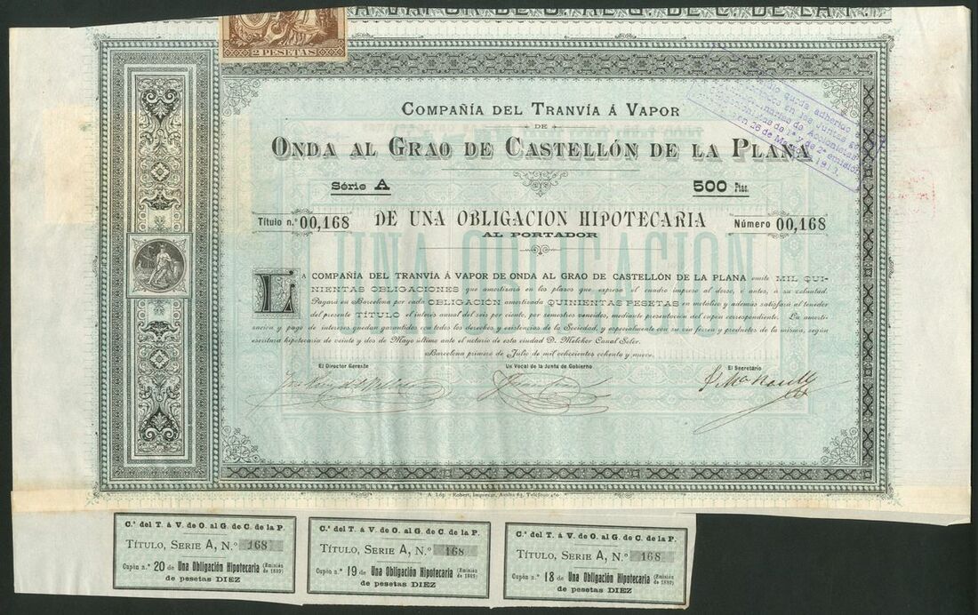 Spain: Compañia del Tranvia á Vapor de Onda al Grao de Castellon de la Plana, 250 peseta share, 1888, series A, 2 examples, #352 and #612; 250 pesta share, 1890, series B, #1624 and 5 shares, 1890, series C, #2143, all of similar design, together with mortgage bond for 500 pesetas, 1889, Series A, #00168, and, mortgage bonds, 1891, 1 bond, series A, #00125 and 5 bonds, series B, #00629, all with coupons. VF and EF (7).