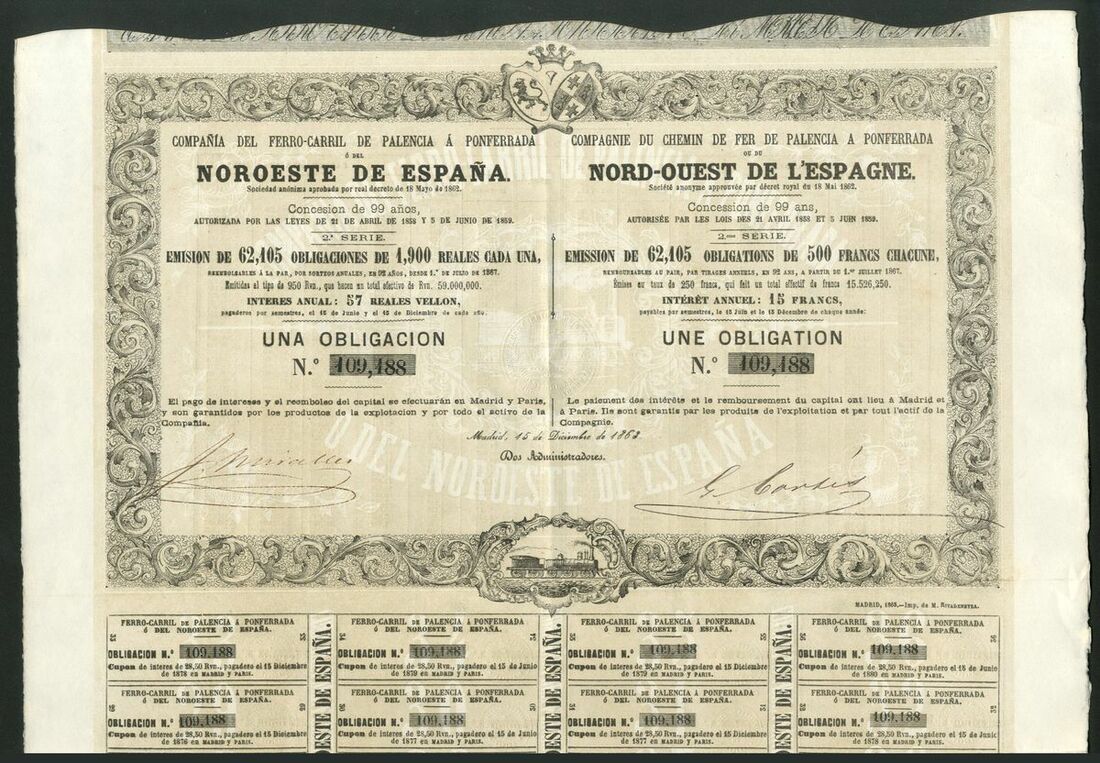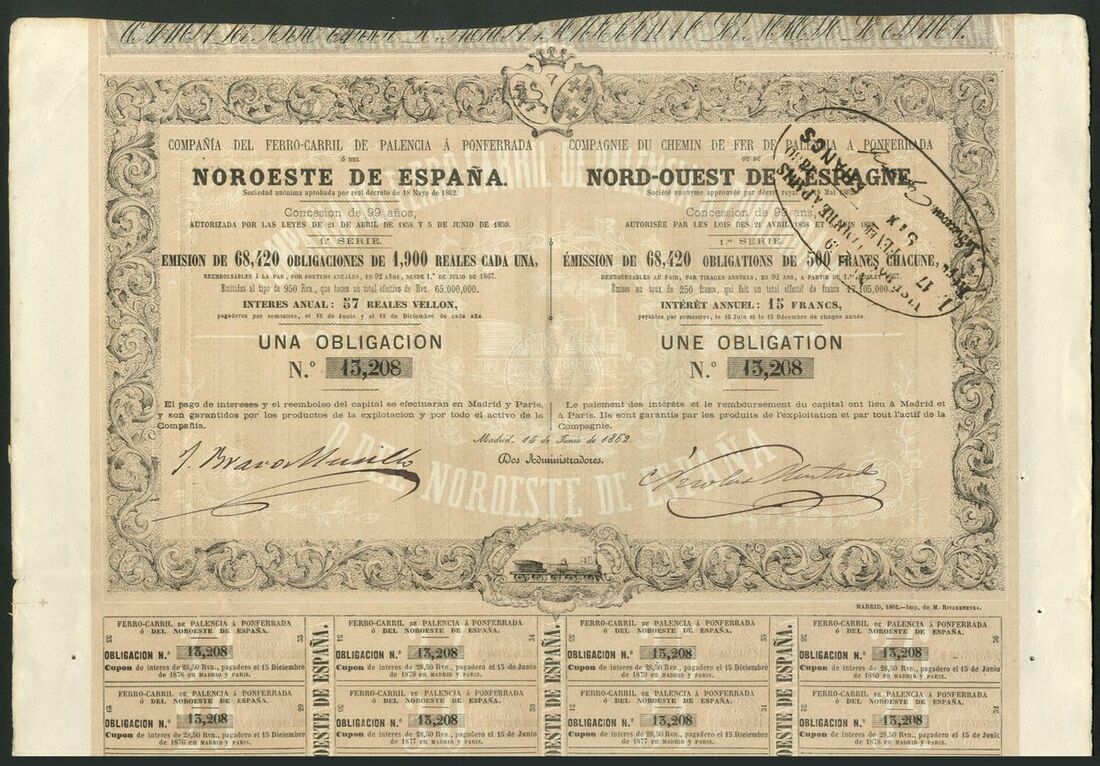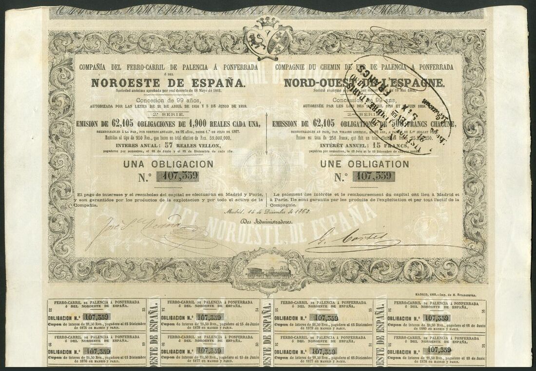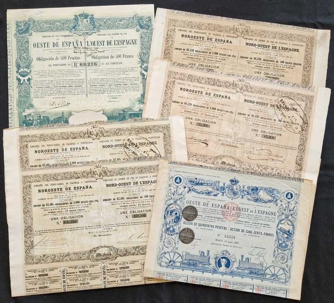 Spain: Compañia del Ferro-Carril de Palencia á Ponferrada ó del Noroeste de España, 1900 reales bonds, 1862 and 1863, 2 examples of each, black, buff underprint, together with Compañia de los Ferro-Carriles del Oeste de España, 500 peseta share, 1888, blue and 500 peseta bond, 1894, green, all with coupons. Generally VF or better (6).