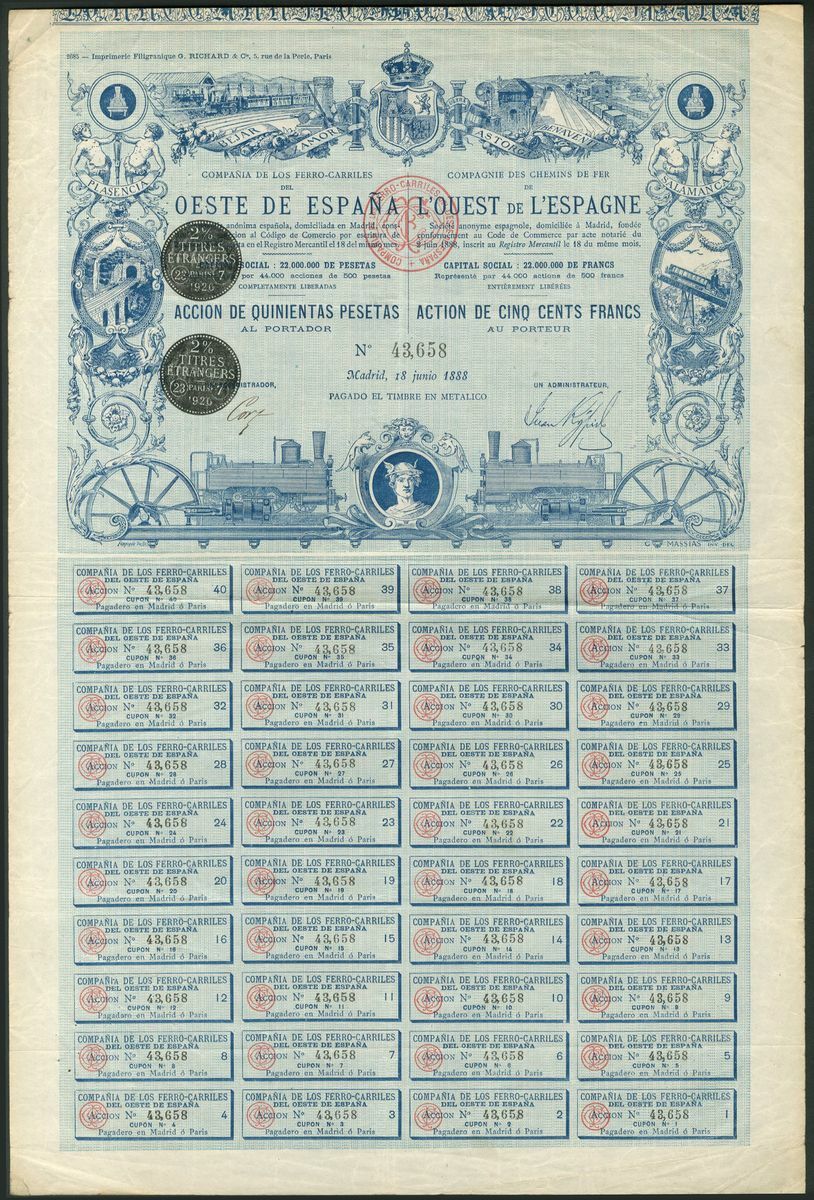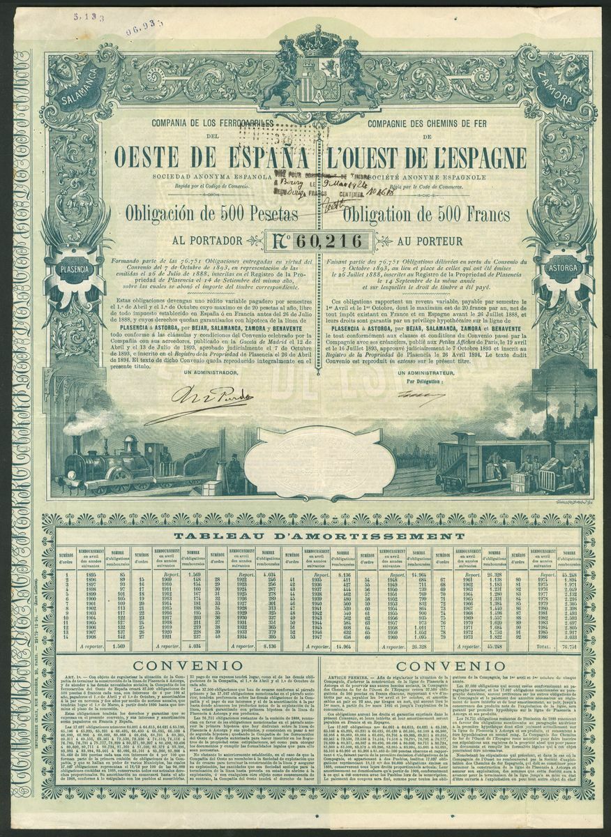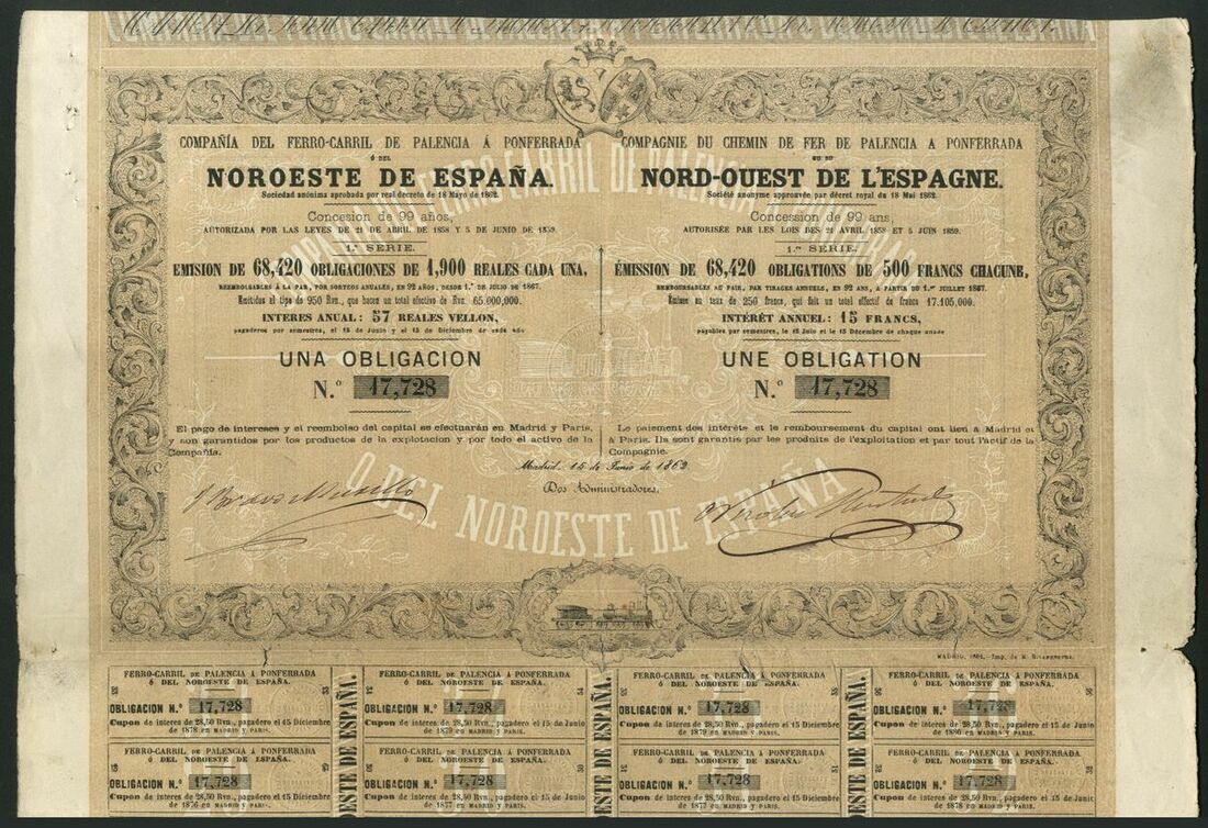 Spain: Compañia del Ferro-Carril de Palencia á Ponferrada ó del Noroeste de España, 1900 reales bonds, 1862 and 1863, 2 examples of each, black, buff underprint, together with Compañia de los Ferro-Carriles del Oeste de España, 500 peseta share, 1888, blue and 500 peseta bond, 1894, green, all with coupons. Generally VF or better (6).