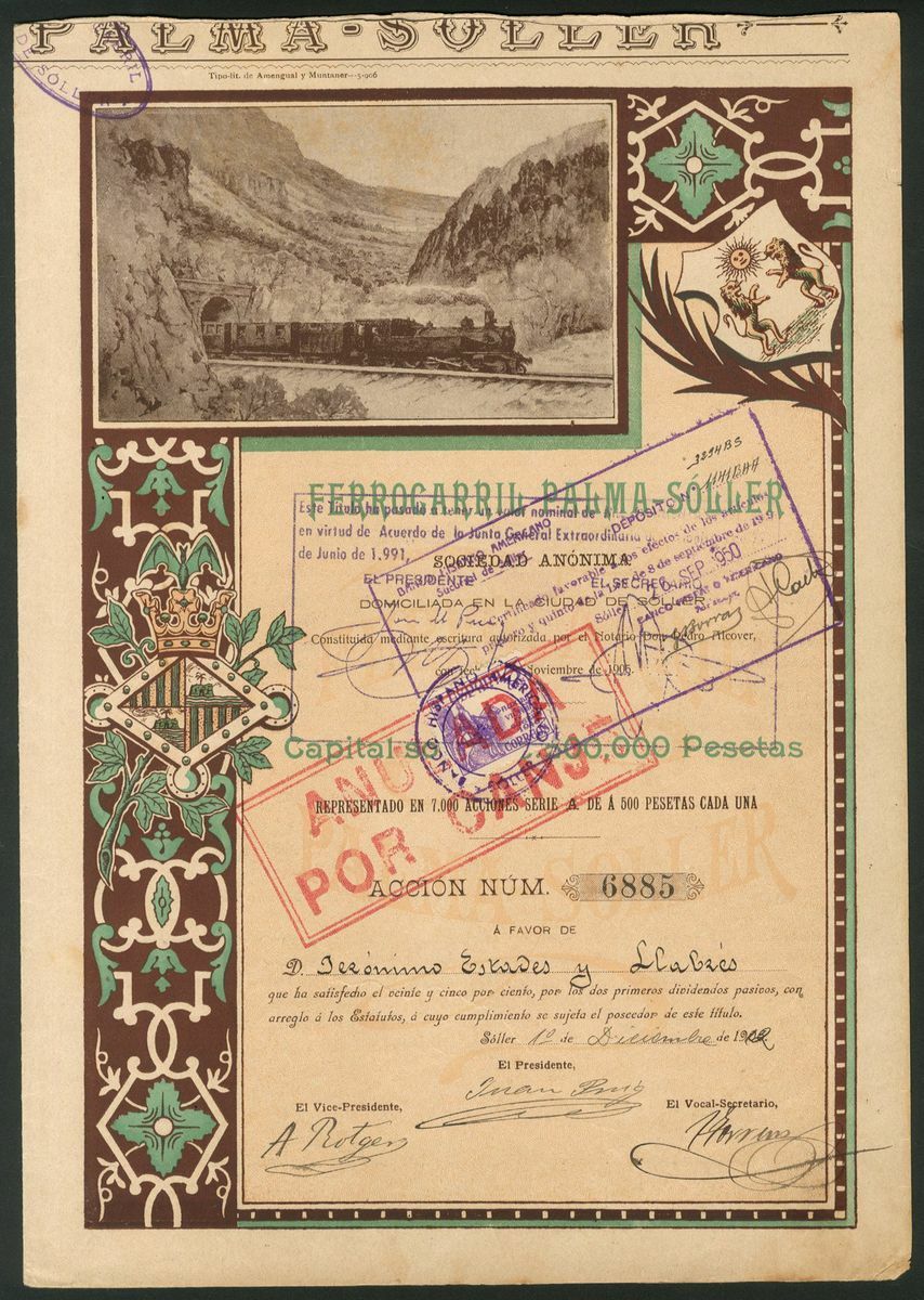Spain: Ferrocarril Palma-Soller, 500 peseta share, 1906[12], #6885, steam train at top, green and brown with yellow underprint, stamped ANULADA. Narrow gauge line in Mallorca, formed in 1905. VF.