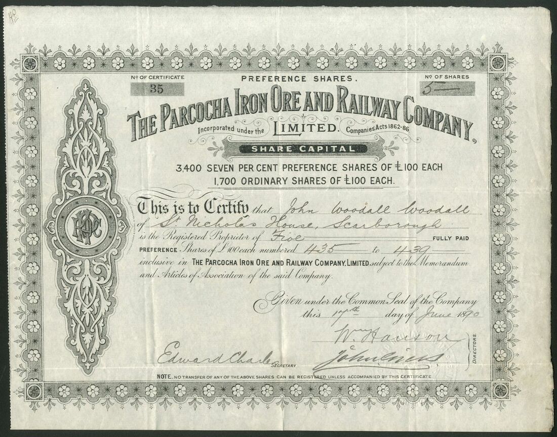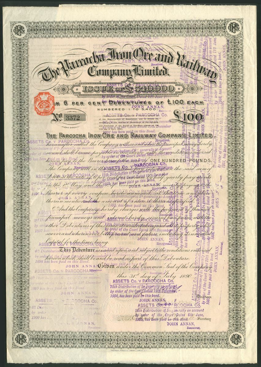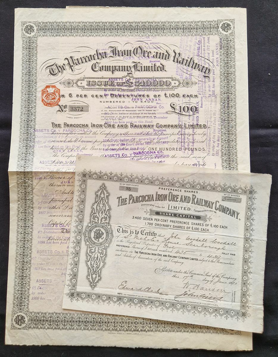 Spain: Parcocha Iron Ore and Railway Company Limited, £100 preference shares, 18[90], #35, black, together with a £100 6% debenture, 1890, #3372, very large format, black with pink underprint, with coupons, many endorsements on face. Registered 11th March 1890 to acquire from Messrs C. de Murrieta & Co. who were in financial difficulty over their Argentine investments, the Parcocha and other mines and railways and wharf facilities connecting to the Bilbao River. In liquidation by 1909. Both VF (2).