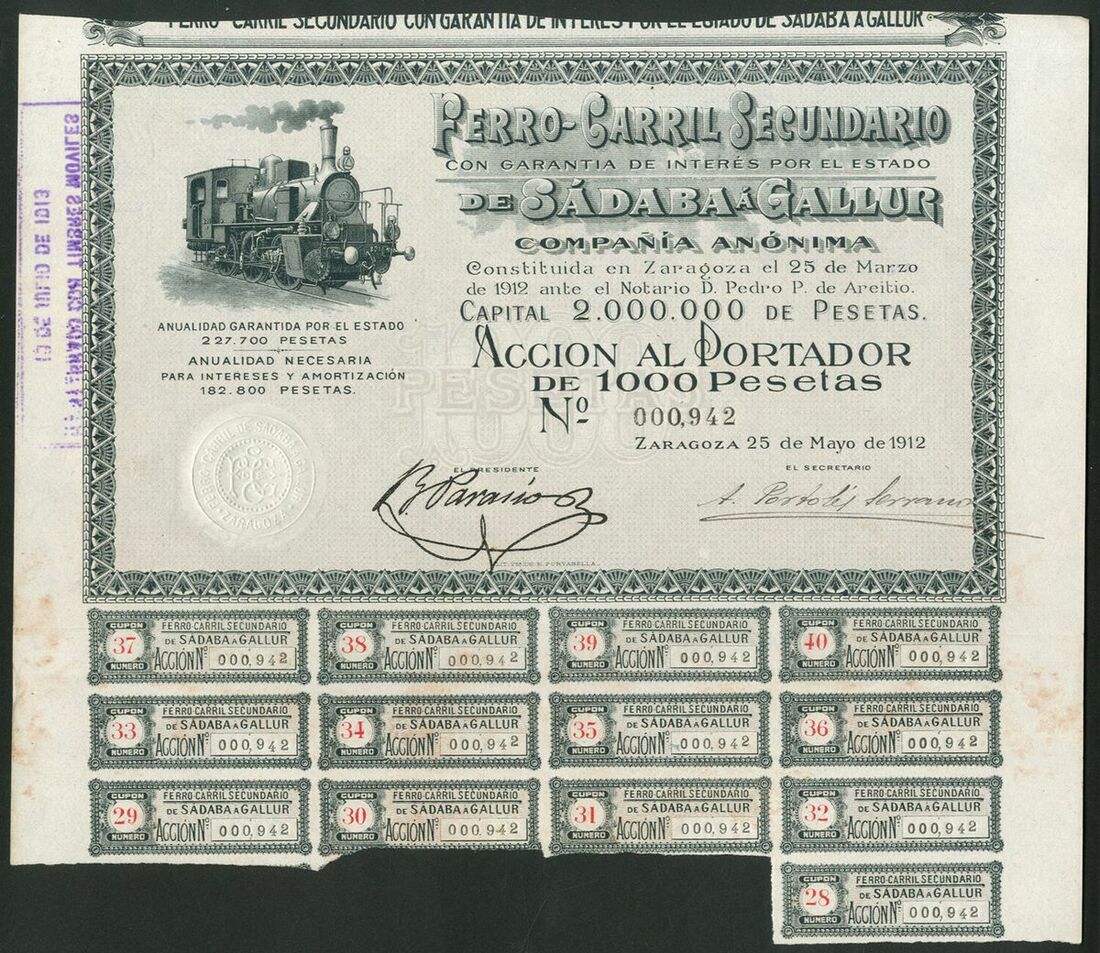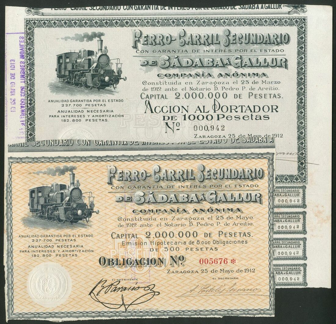 Spain: Ferro-Carril Secundario con Garantia de Interés por el Estado de Sádaba á Gallur, 1000 peseta share, Zaragoza 1912, #942, together with 500 peseta bond, Zaragoza 1912, #5676, similar design with steam train top left, black with blue underprint and yellow underprint respectively, the first with coupons. EF (2).