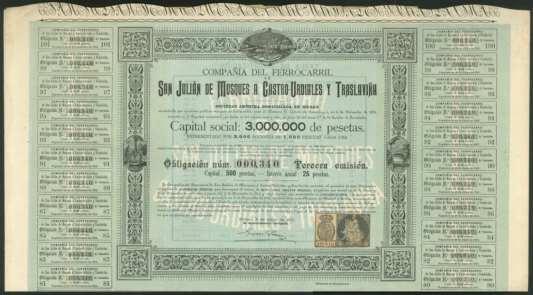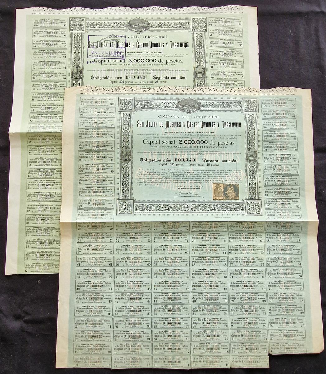 Spain: Compañia del Ferrocarril de San Julián de Musques á Castro-Urdiales y Traslaviña, a pair of bonds for 500 pestas, 2nd issue, 1899, #2943, green and 500 pesetas, 3rd issue, 1901, #0340, blue, with coupons. A narrow gauge line in Bilbao, State owned by 1957. EF (2).