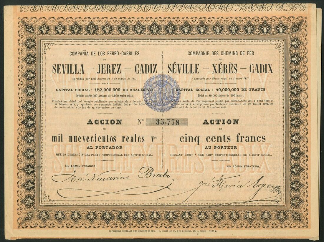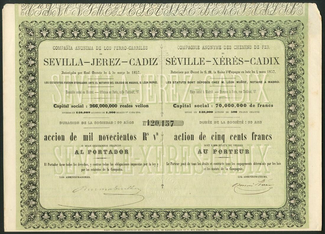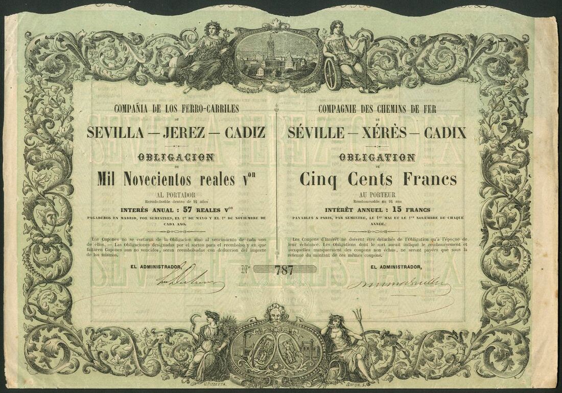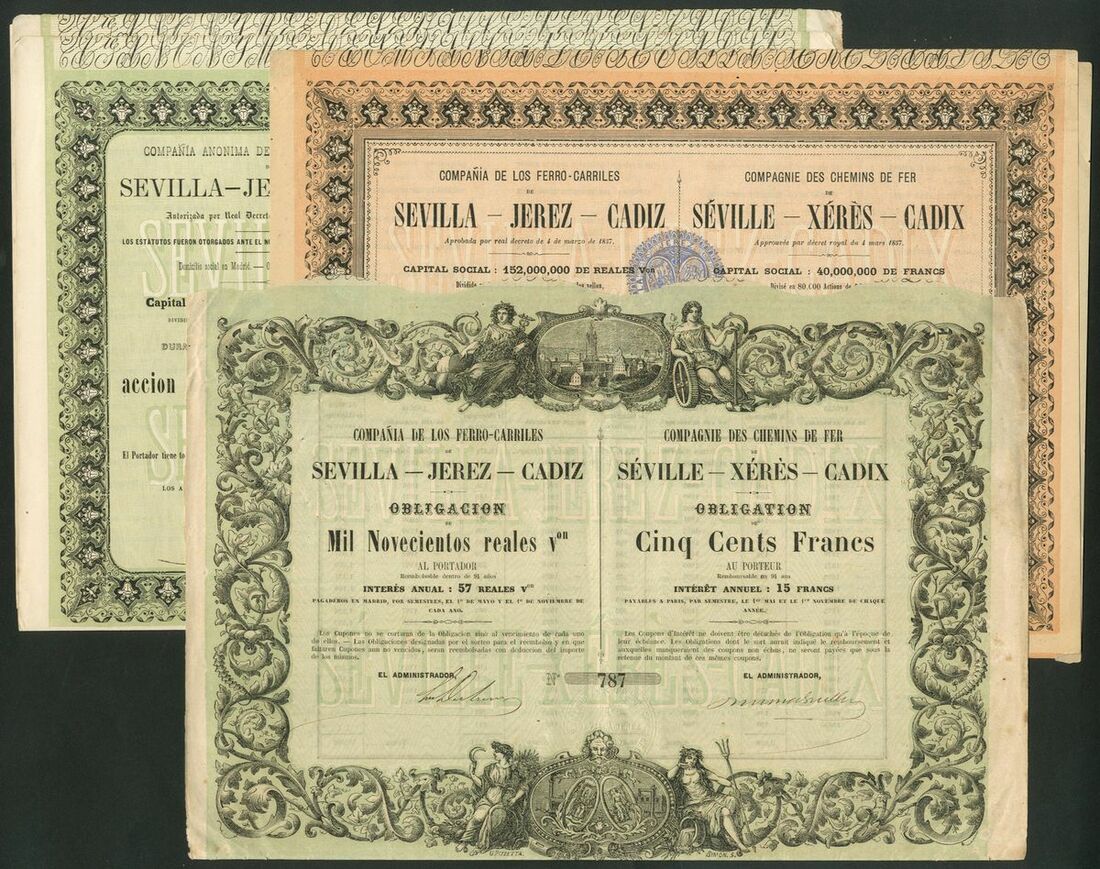 Spain: Compañia Anonima de los Ferro-Carriles de Sevilla-Jerez-Cadiz, 1900 reales share, [1864], 2 examples, #120157 and #120158, green, together with another [1873], yellow, and, 1900 reales obligacion, [1858], #787, green, all with coupons. Became part of Ferro-Carriles de Andaluces in 1877. VF-EF (4).