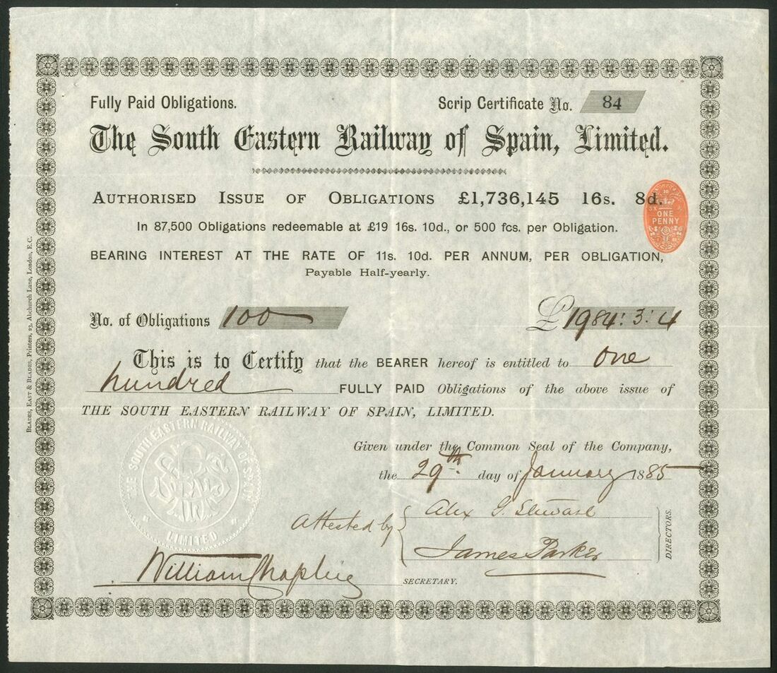 Spain: South Eastern Railway of Spain Ltd., a scrip certificate for [100] bonds of £19 16s 10d, 18[85], #84, black. Not recorded in Boone/Shakespeare. VF and rare.