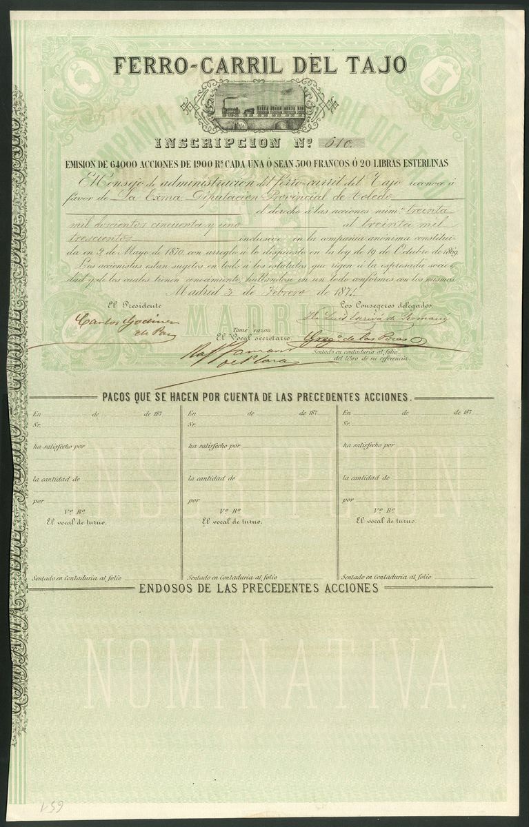 Spain: Ferro-Carril del Tajo, inscription #610 for [50] shares of 1900 reales, Madrid 187[1], attractive piece with steam train at top, green and black, with coupons. Incorporated in Madrid 9th May 1870 to build a line from Madrid to Plasencia. Acquired by Ferro-Carriles Madrid a Caceres y á Portugal. EF and scarce.