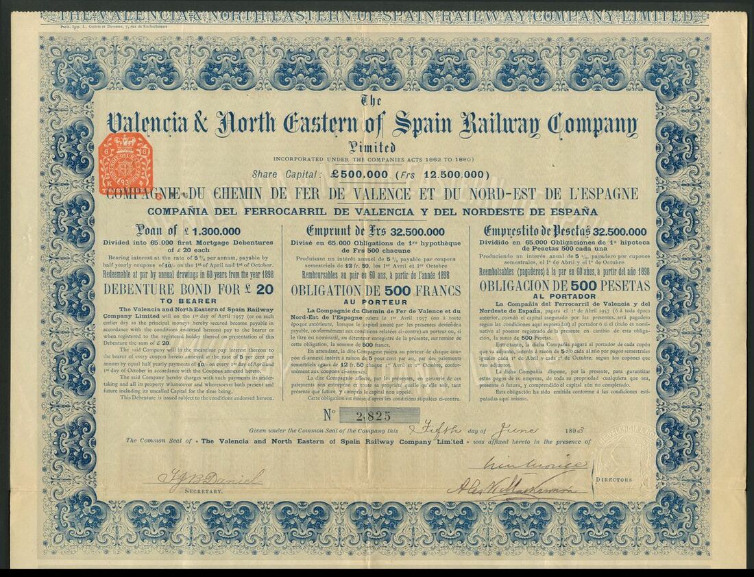 Spain: Valencia & North Eastern of Spain Railway Company Limited, £20 debenture, 189[3], #2825, large format, blue, text in English, French and Spanish, with coupons. Together with a provisional certificate for 500 franc bond, [1893], #3348, black on blue paper. Registered in London in 1889 to acquire the concession for a line from Calatayud to Teruel and Sagunto. Concession acquired by Construction de Chemins de Fer en Espagne in 1896. VF and scarce, the second with edge tears (2).