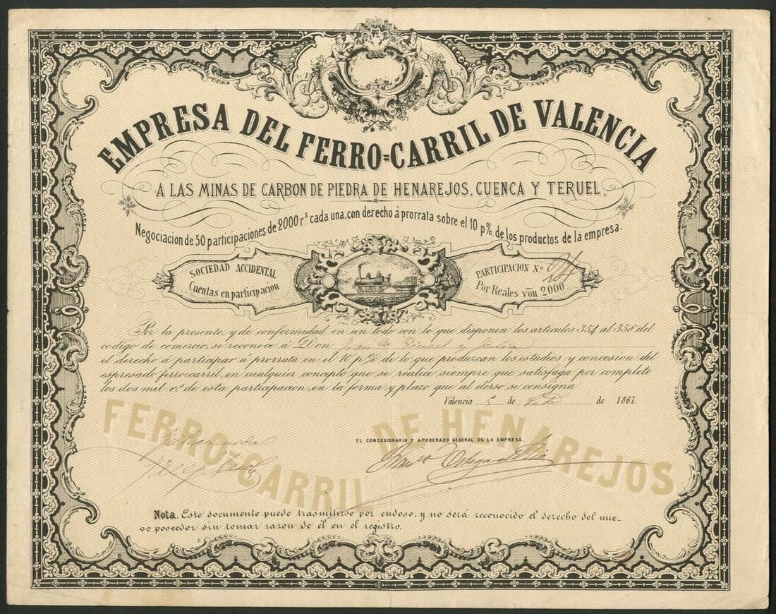 Spain: Empresa del Ferro-Carril de Valencia, a las Minas de Carbon de Piedra de Henarejos, Cienca y Teruel, 'participation' of 2000 reales, of only 50 issued, 1867, #24, small steam train in centre, black. VF and scarce.