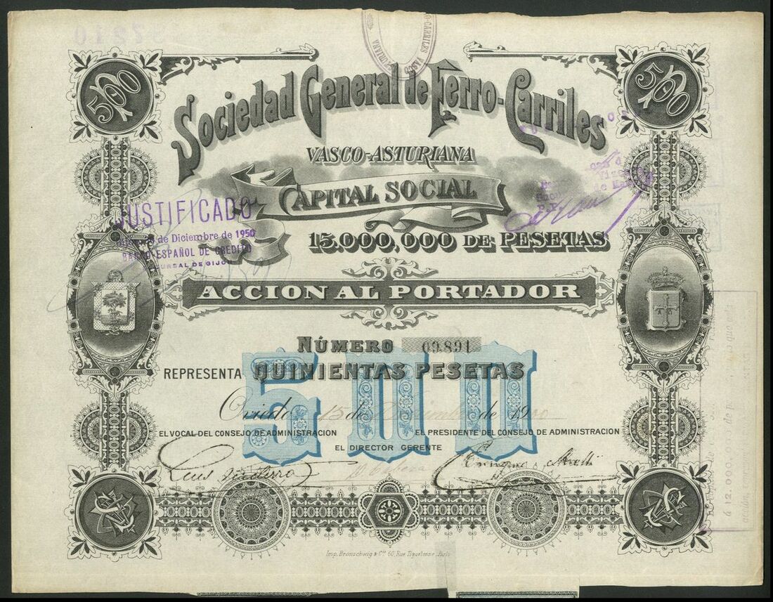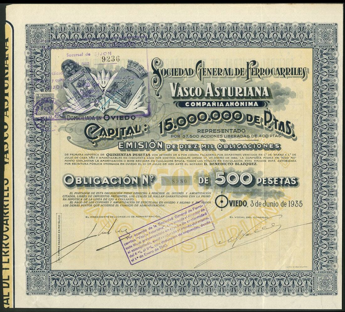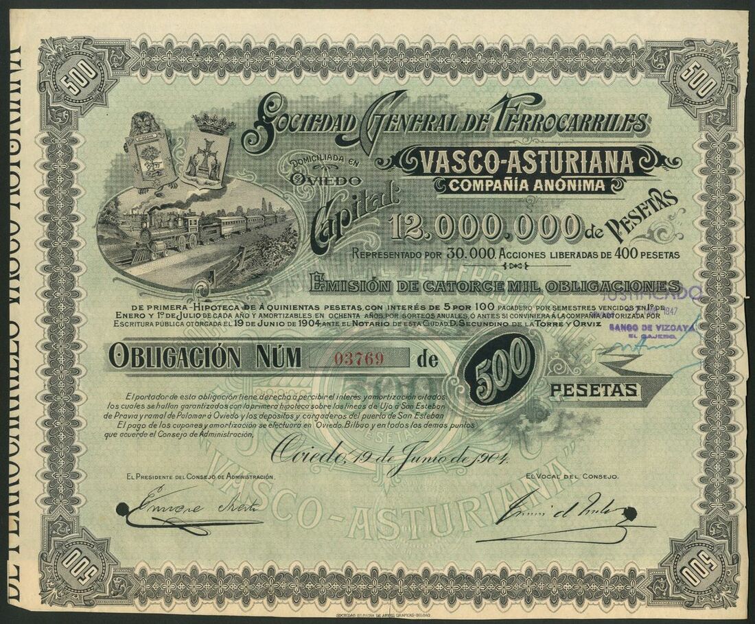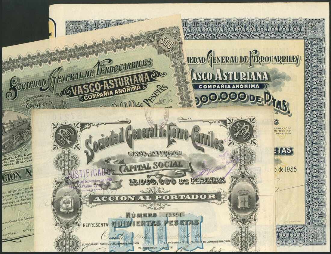 Spain: Sociedad General de Ferro-Carriles Vasco-Asturiana, a series of certificates comprising 50 peseta share, Oveido 19[00], #9891; 500 peseta bond, 1904, #3769, steam train at left, cancelled, and, 500 peseta bond, 1935, #9236, arms at top left. VF-EF (3).