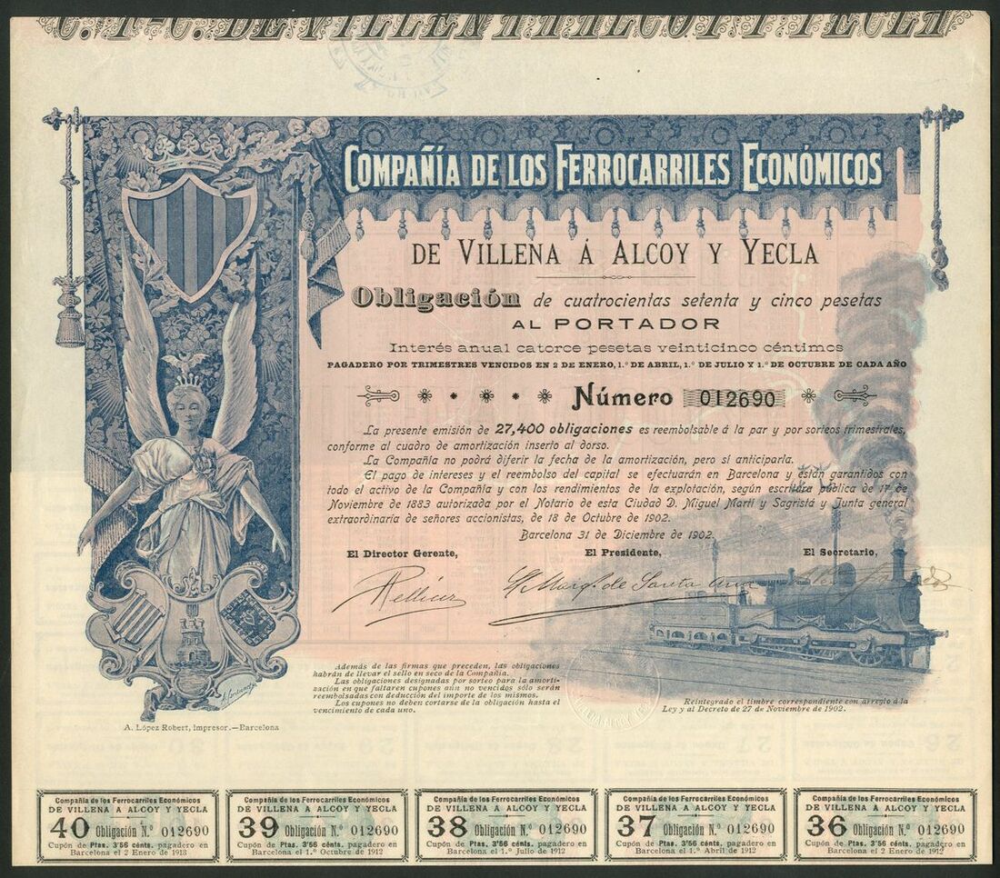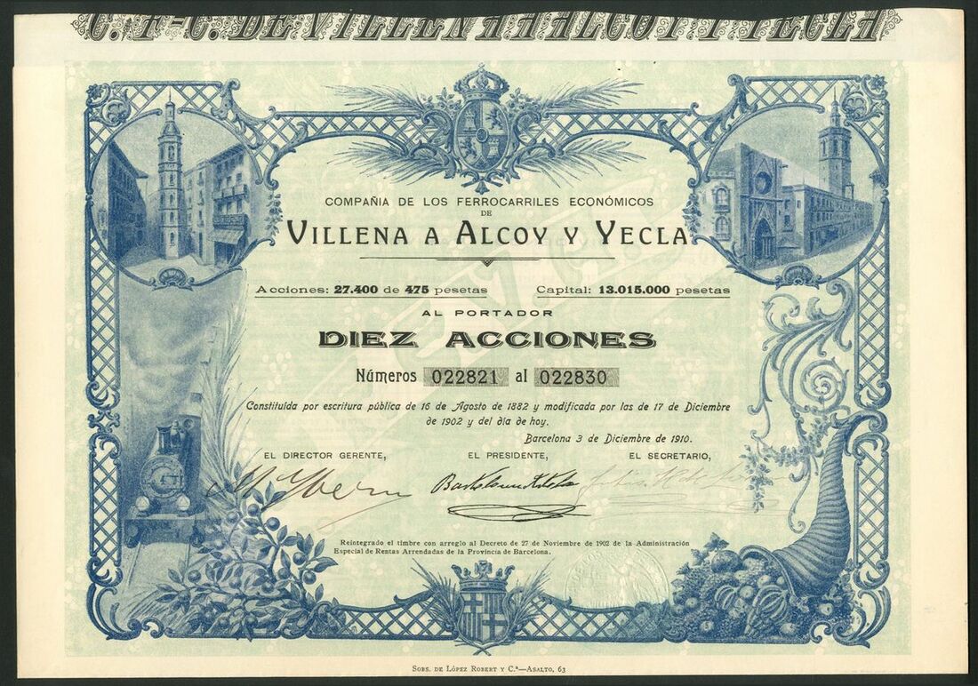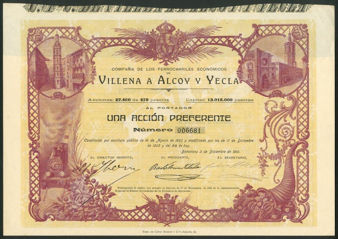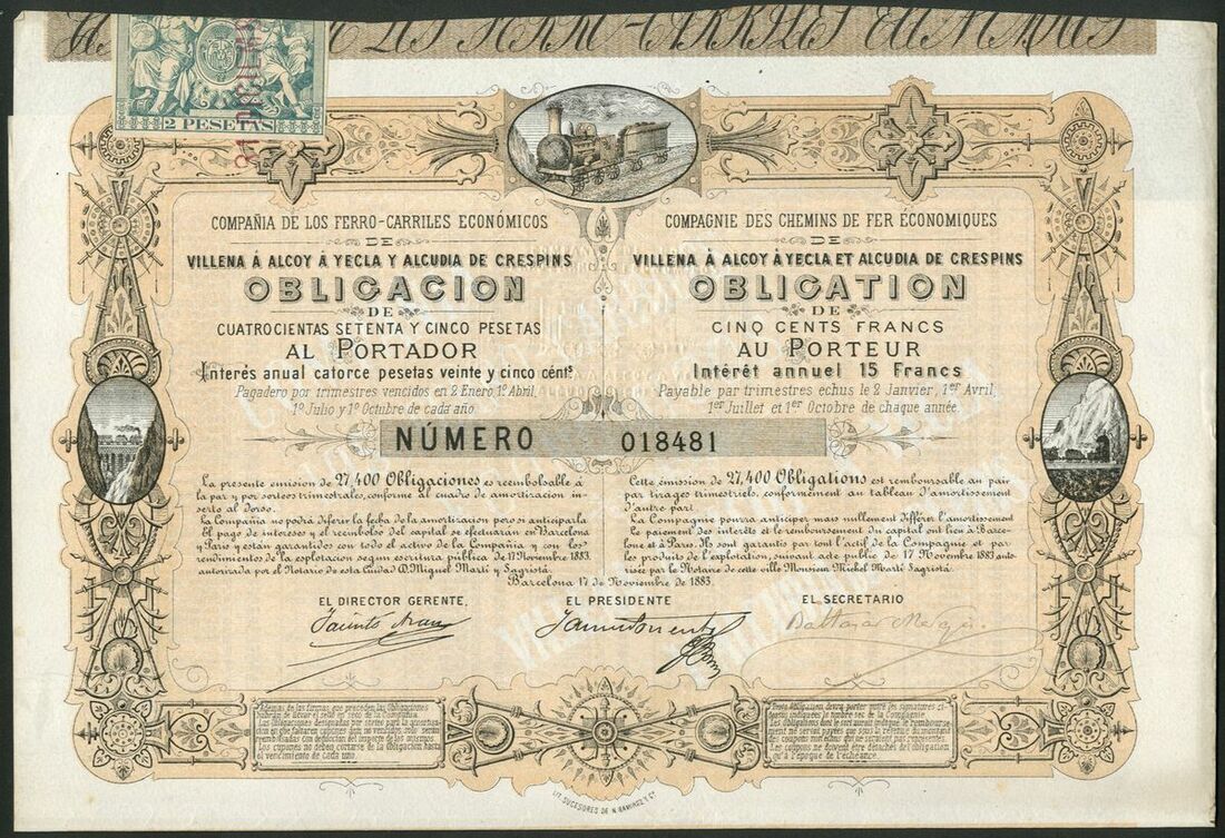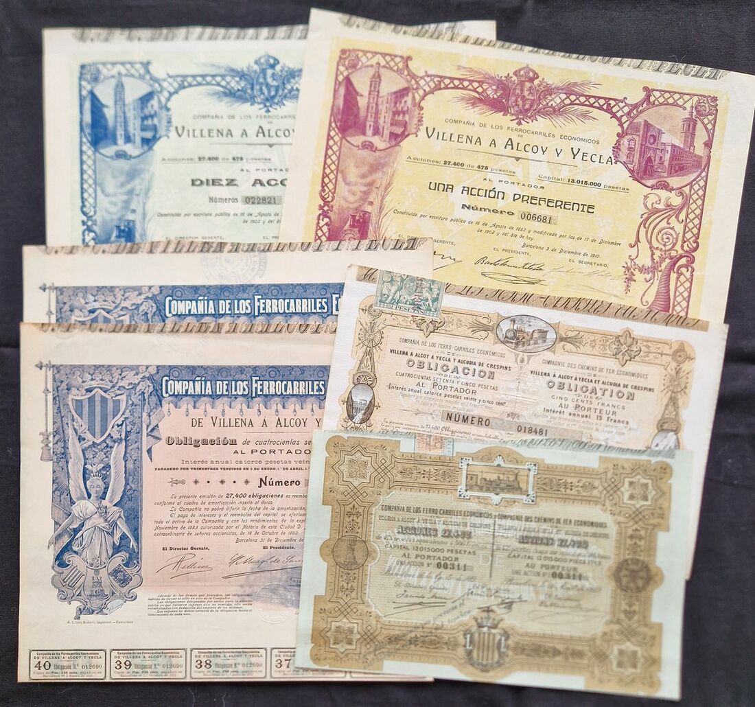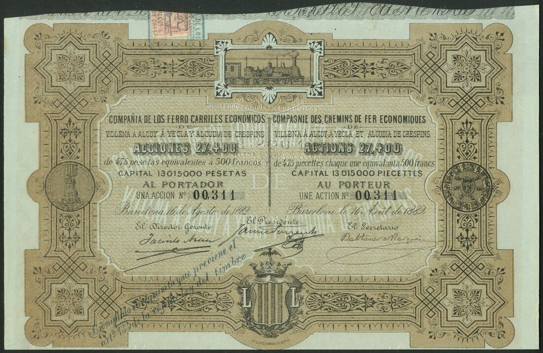 Spain: Compañia de los Ferro-Carriles Económicos de Villena á Alcoy y Yecla y Alcudia de Crespins, 475 peseta share, Barcelona 1882, #311, and also a bond for 475 pesetas, 1883, #18481. Together with 475 peseta bonds, 1902, preference share, 1910 and 10 shares, 1910, issued following a change of name which dropped Alcudia de Crespins from the title. All EF (6).