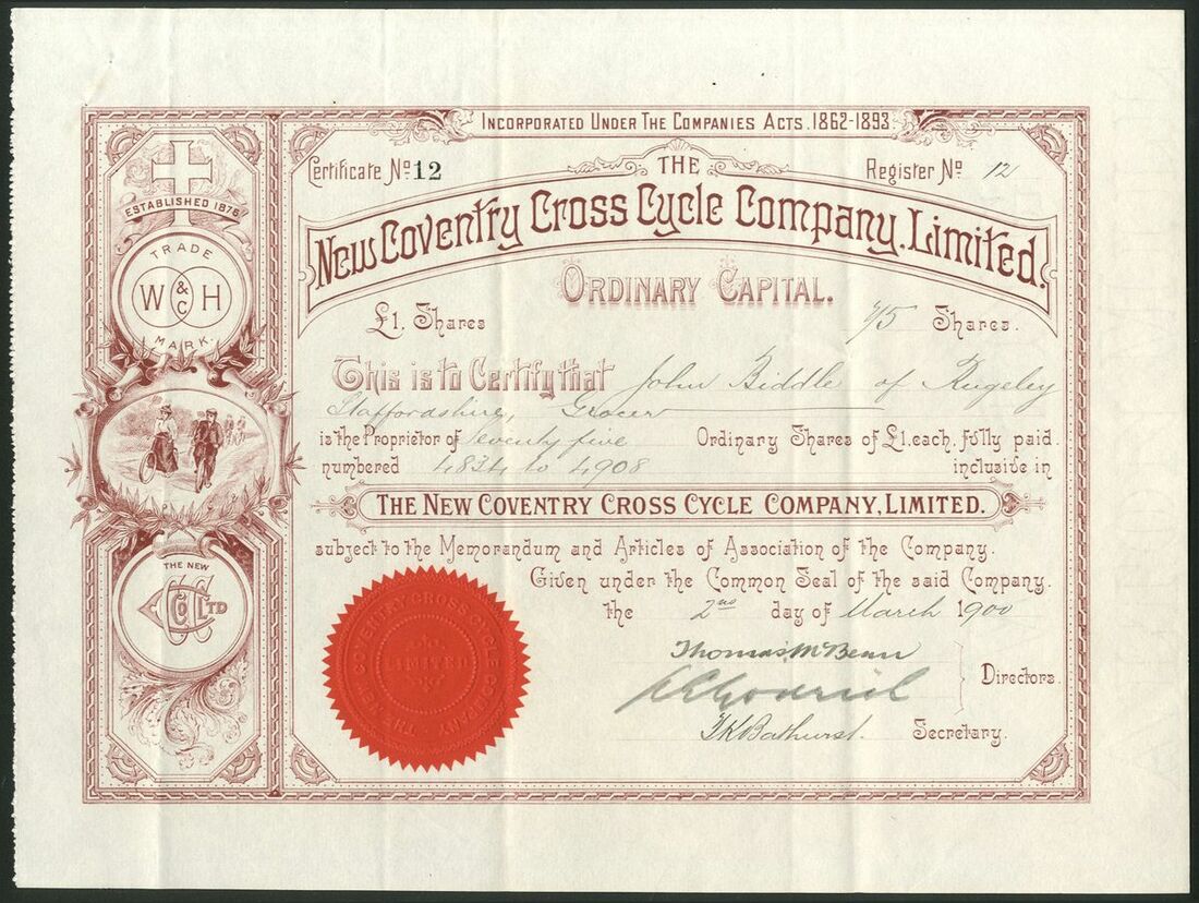 Great Britain: New Coventry Cross Cycle Company Limited, £1 ordinary shares, 1[900], #12, attractive vignette of cyclists at left, brown, red seal. Established in 1876 as Warman and Hazlewood and then registered as Coventry Cross Cycle Co. Ltd. Reconstructed as this in 1899. In Liquidation in 1902. Coventry Cross cycles however were still being sold in 1939! GVF and rare. First time at auction.