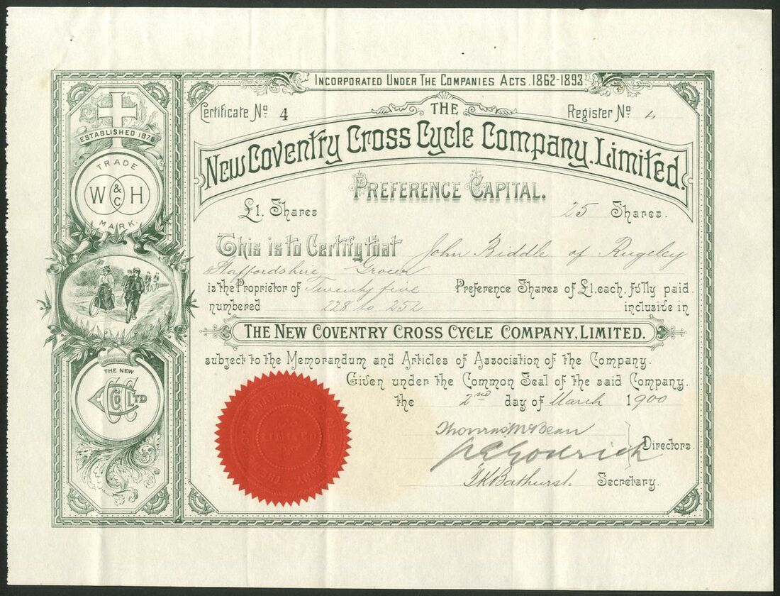 Great Britain: New Coventry Cross Cycle Company Limited, £1 preference shares, 1[900], #4, attractive vignette of cyclists at left, green, red seal. Established in 1876 as Warman and Hazlewood and then registered as Coventry Cross Cycle Co. Ltd. Reconstructed as this in 1899. In Liquidation in 1902. Coventry Cross cycles however were still being sold in 1939! GVF and rare. First time at auction.