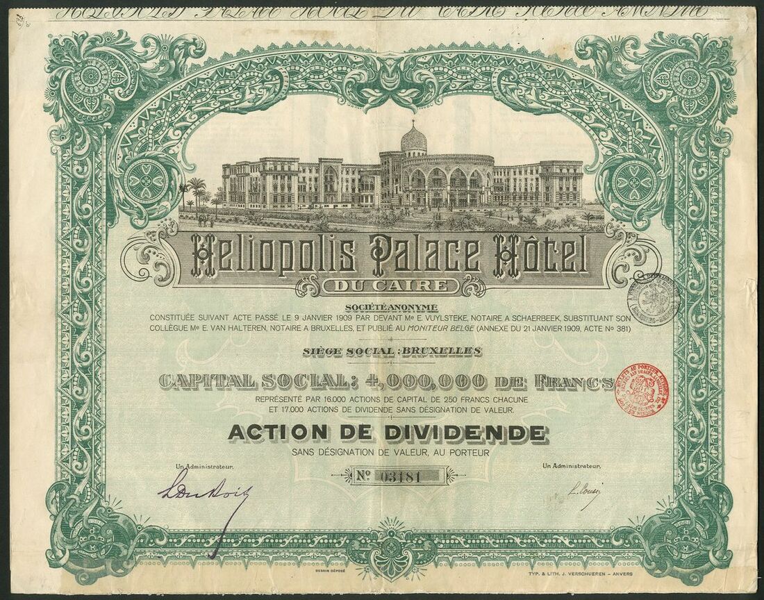 (x) Egypt: Heliopolis Palace Hotel de Caire, 'action de dividende', 1909, #3181, large vignette of the hotel at top, green and black, with coupons. Opened in 1911 and advertised as the most luxurious hotel in the world. The 500 room building was used during both world wars as a military hospital. After the war and the increase in cheap tourism the hotel could not compete with modern hotels and it was abandoned only to be used briefly as Government offices. However it was turned into the Presidential palace by President Mubarak and has a new lease of life! VF.