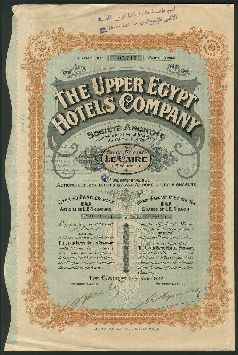 (x) Egypt: Upper Egypt Hotels Company, certificate for 10 shares of E£4, Cairo 1922, #5719, ornate border, orange and black with blue underprint, text in English and French, with coupons. The company, incorporated in 1905, acquired the Cataract Hotel at Assouan in 1905 and also built the Winter Palace at Luxor in 1907. AVF.
