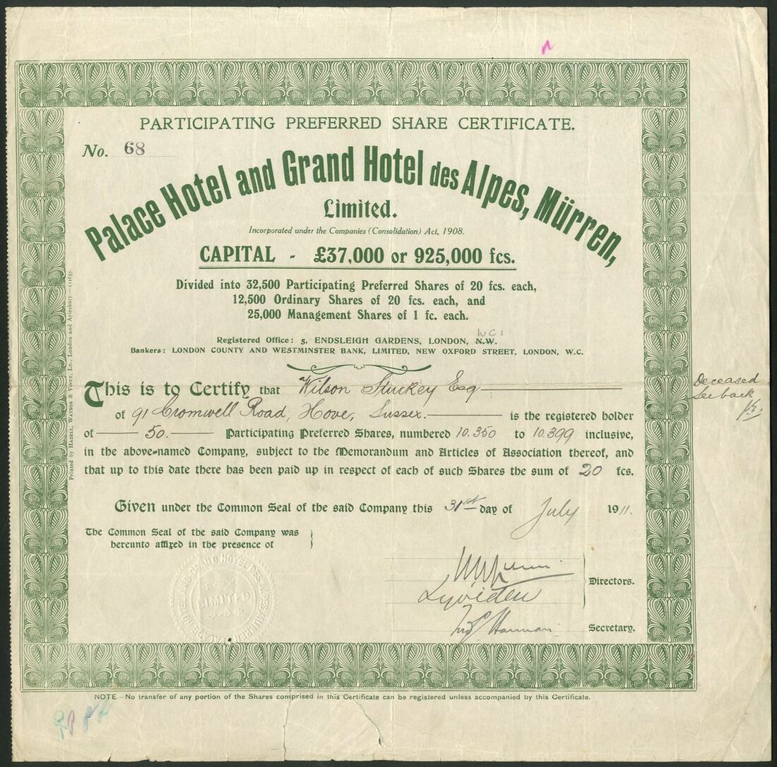 (x) Switzerland: Palace Hotel and Grand Hotel Des Alpes, Mürren, Ltd., Participating Preferred shares, 19[11], #68, green. Registered 1910 as Grand Hotel Des Alpes, Mürren, Ltd. and name changed to this in 1911, presumably on the acquisition of the Palace Hotel also. Repaired tears, F-VF and rare.
