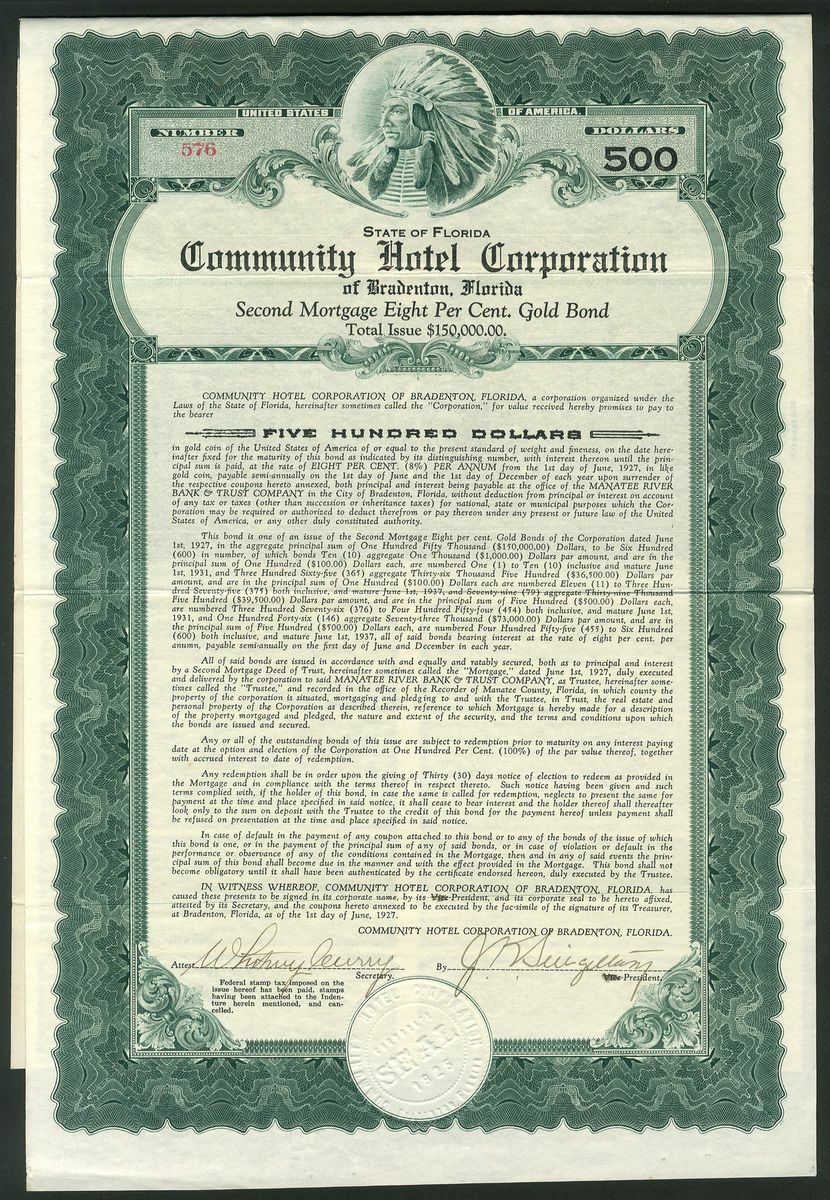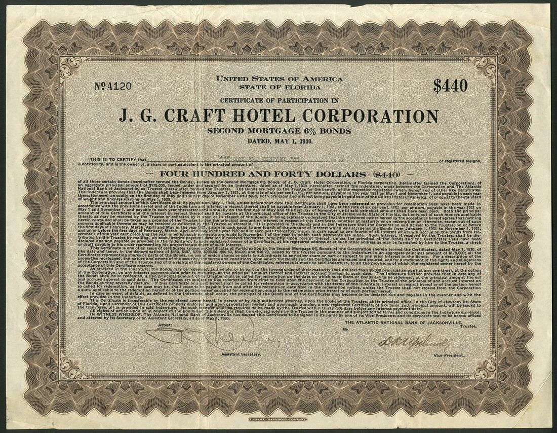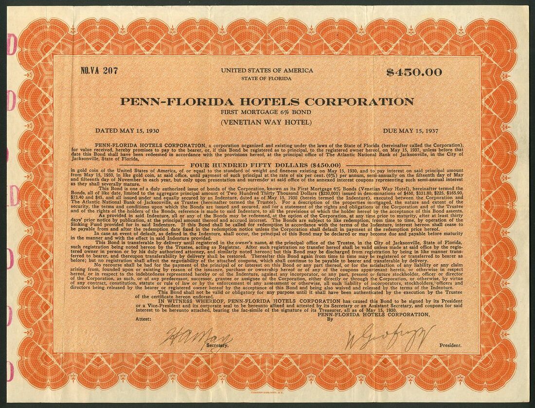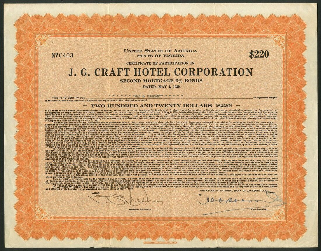 (x) U.S.A: A collection of Florida Hotel certificates, comprising Mira-Mar Hotel, $1000 bond, 1923. Built in Sarasota in 1924, demolished in 1982; Community Hotel Corporation, Bradenton, $500 second mortgage 8% bond, 1927; Penn-Florida Hotels Corporation, 6% First Mortgage bond for $450, 1930. Acquired the Venetian Way Hotel which had been built in 1925; J. G. Craft Hotel Corporation, second mortgage 6 bonds for $44, $220 and $440, all 1930. Operators of the El Verano Hotel in Palm Beach. F-VF, the third with some rust marks and discolouration (7).