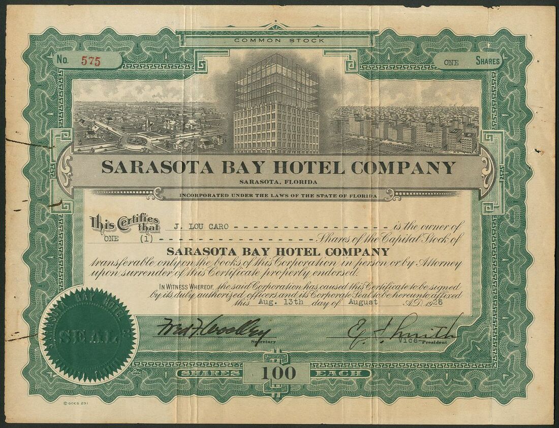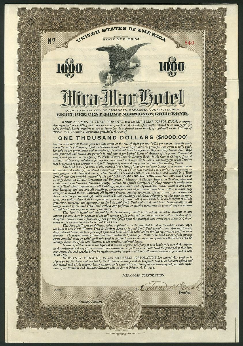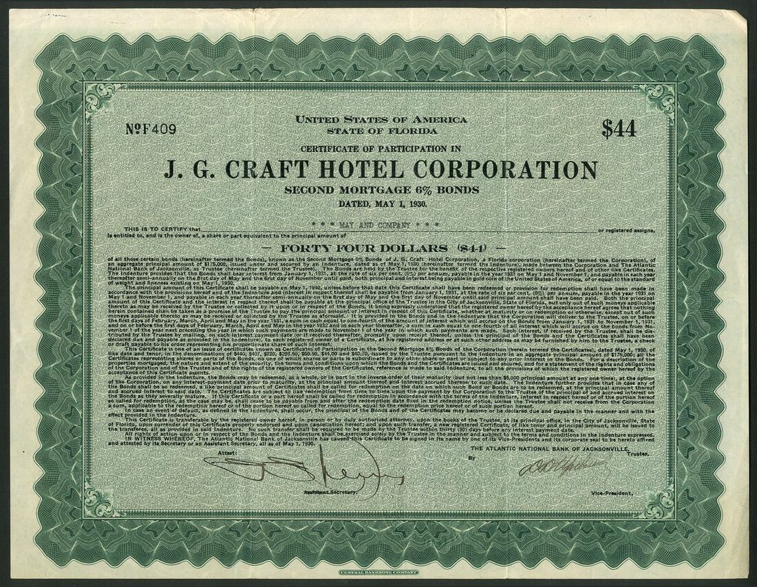 (x) U.S.A: A collection of Florida Hotel certificates, comprising Mira-Mar Hotel, $1000 bond, 1923. Built in Sarasota in 1924, demolished in 1982; Community Hotel Corporation, Bradenton, $500 second mortgage 8% bond, 1927; Penn-Florida Hotels Corporation, 6% First Mortgage bond for $450, 1930. Acquired the Venetian Way Hotel which had been built in 1925; J. G. Craft Hotel Corporation, second mortgage 6 bonds for $44, $220 and $440, all 1930. Operators of the El Verano Hotel in Palm Beach. F-VF, the third with some rust marks and discolouration (7).