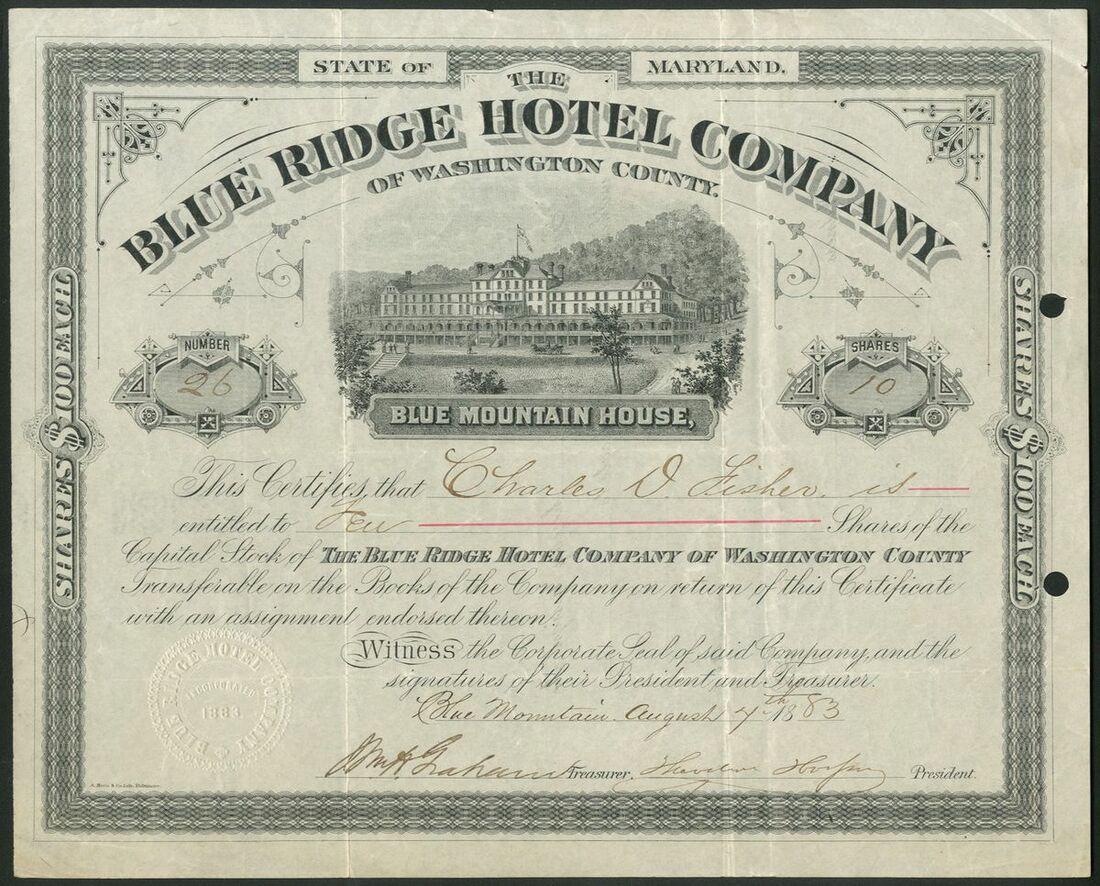 (x) U.S.A.: Blue Ridge Hotel Company, $100 shares, 18[83], #26, attractive vignette of Blue Mountain House, black. Incorporated in Maryland in 1883 to build this 300 room hotel overlooking the Cumberland and Shenandoah Valleys. Receiver appointed in 1906 and the hotel sold for only $20,000 in 1907, the buyers incorporating the Blue Mountain House Company to operate it. Burnt to the ground on 5th August 1913. Filing holes at right otherwise VF.