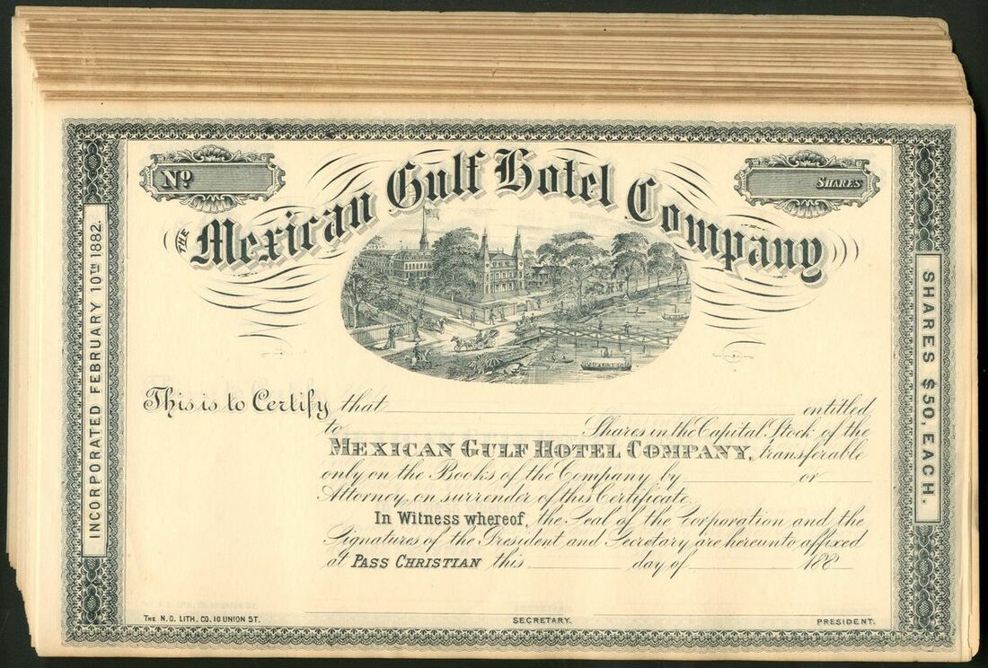 (x) U.S.A.: Mexican Gulf Hotel Company, a large group of 72 unissued certificates for $50 shares, 188-, view of hotel, black. Incorporated10th February 1882 to build and operate the large Colonial style Hotel overlooking the Gulf of Mexico in Mississippi. Sold to new owners in 1902 and again in 1916 and it burned down 8th January 1917. Mostly EF (72).