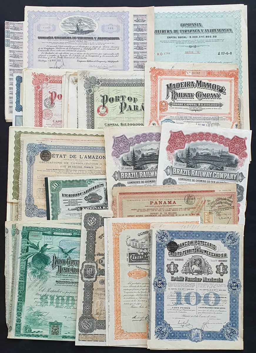 A group of Mexico, Central and South American certificates (39), including 2 examples of Banco Central Mexicano, 1905. Mixed condition but generally VF. See images for more detail (39).